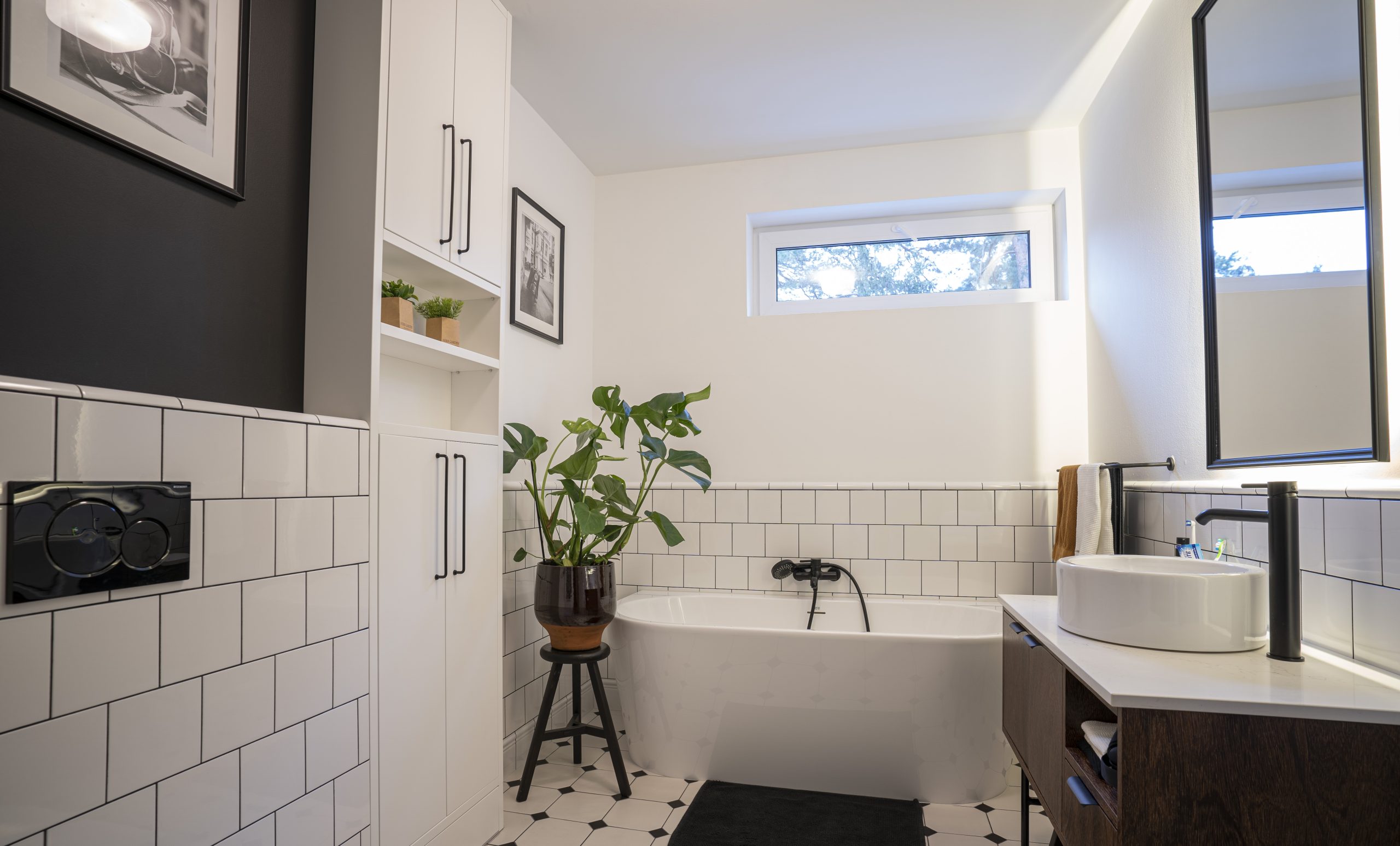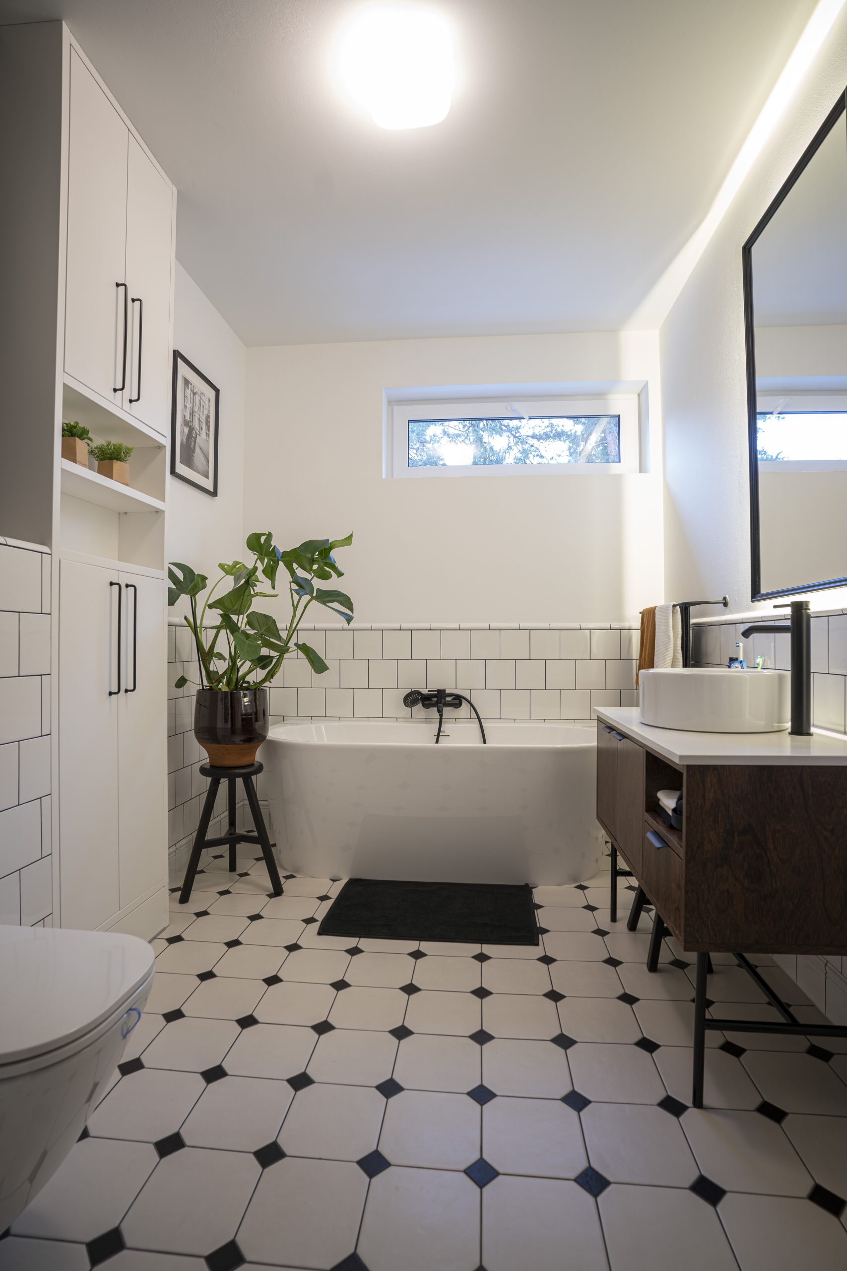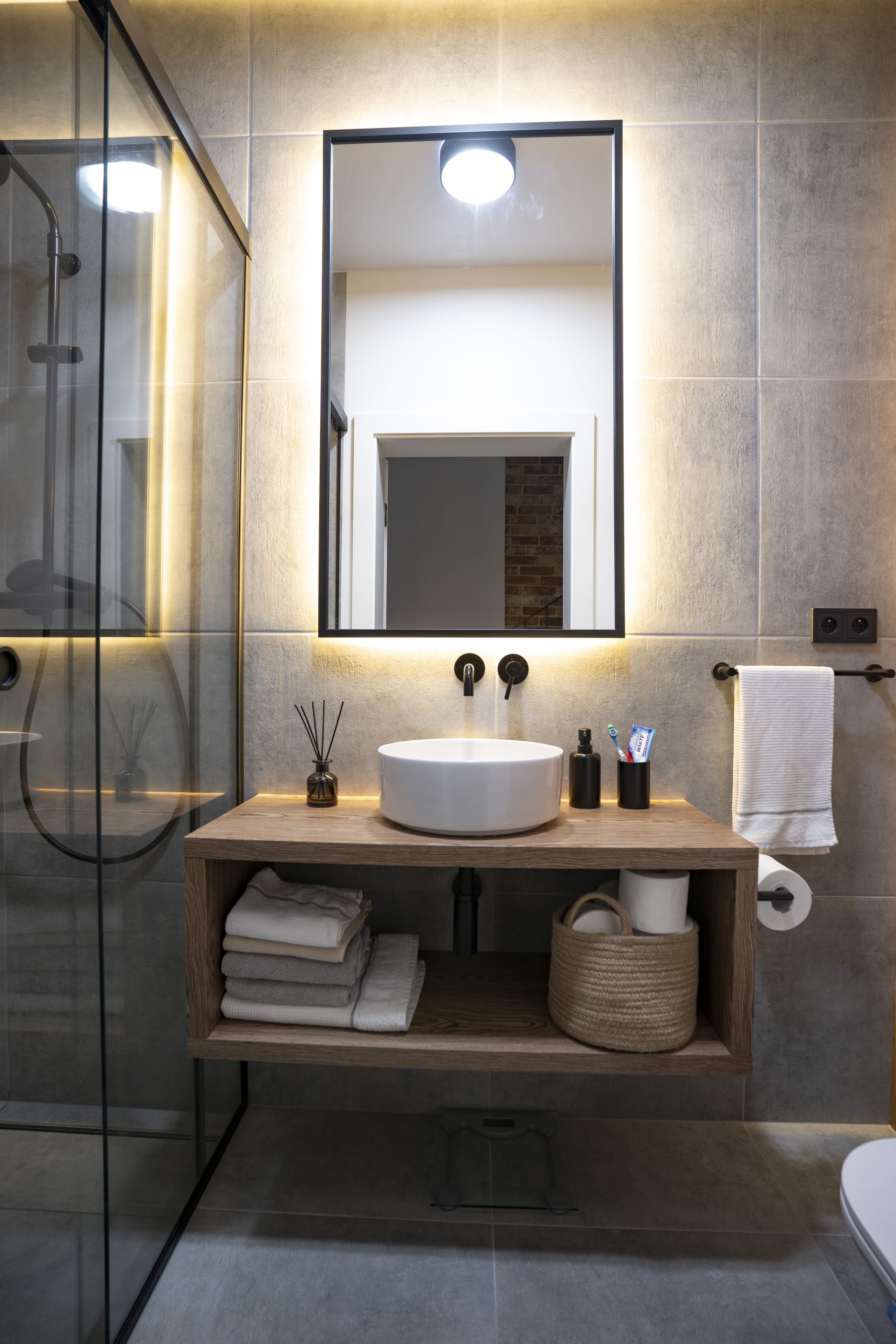 W łazienkach pojawiły się dwa podejścia – jedna szafka stojąca na metalowym stelażu w stylu loftowym, druga – fornirowana, rozbudowana o szafki nad geberitem i elegancką wnękę.
