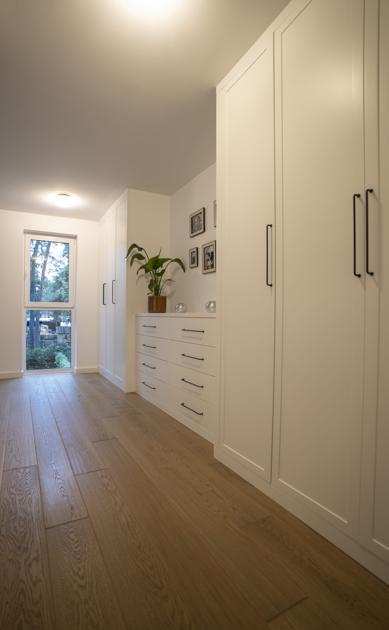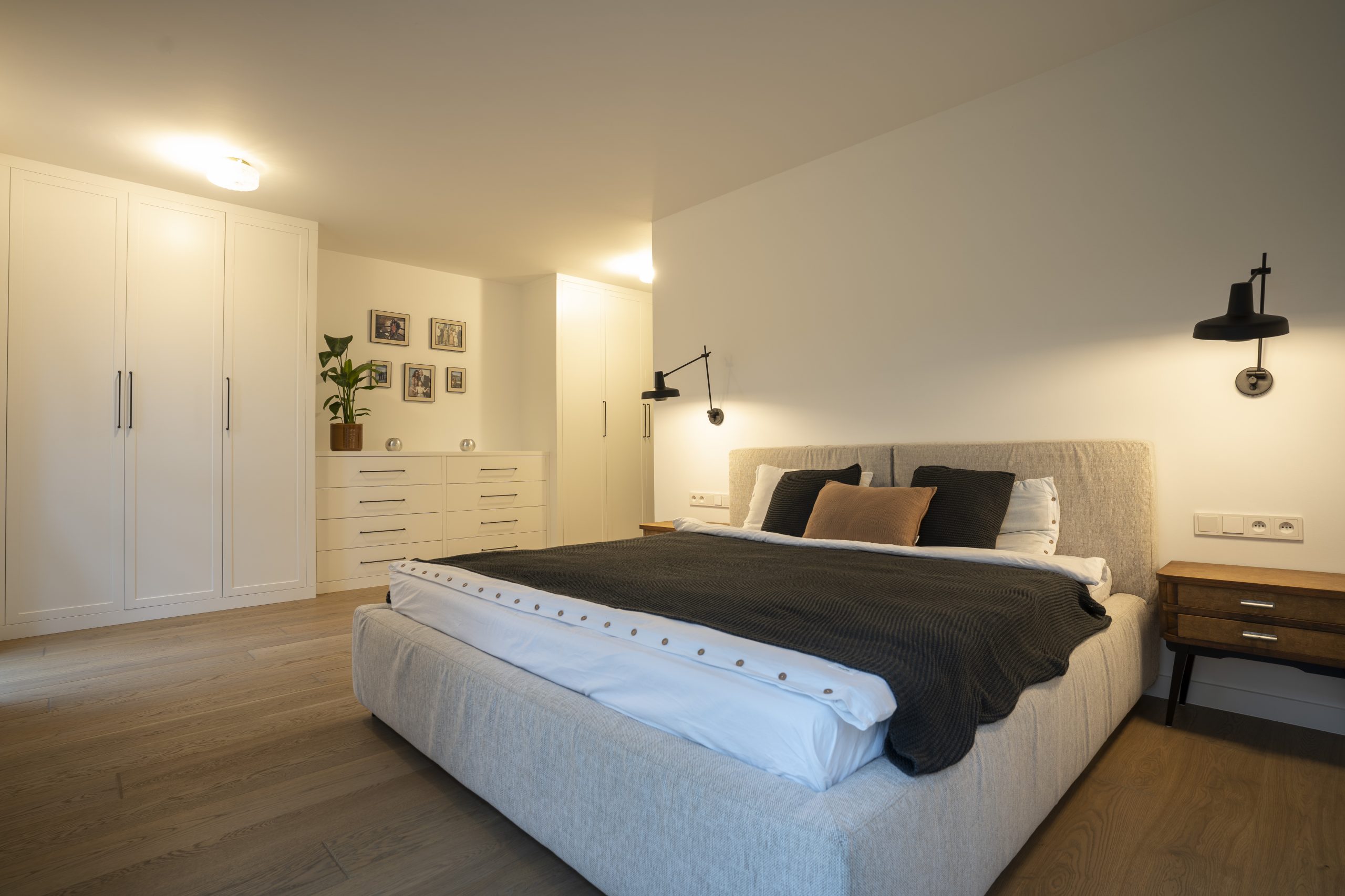 W sypialni zabudowa obejmuje dwie szafy boczne z komodą pośrodku – wszystko w frezowanym lakierze, w spójnym rytmie z resztą domu.