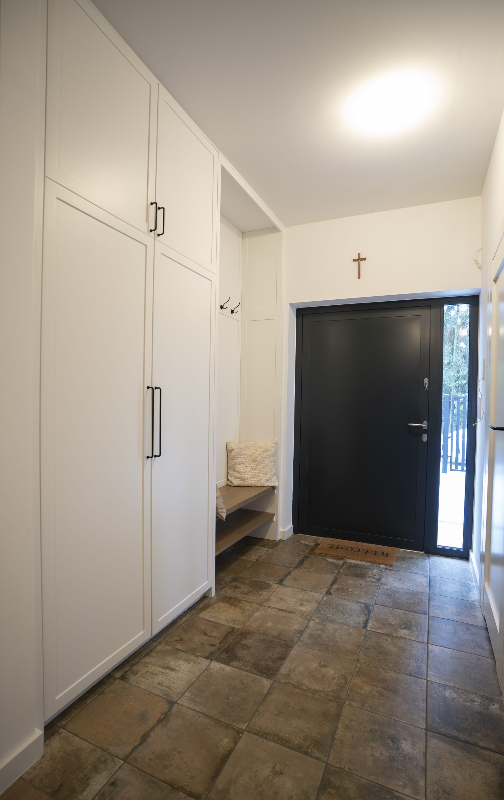 W wiatrołapie – podobna zabudowa uzupełniona o siedzisko z fornirowanej płyty, co tworzy nie tylko miejsce do przechowywania, ale i przyjemną strefę wejściową.