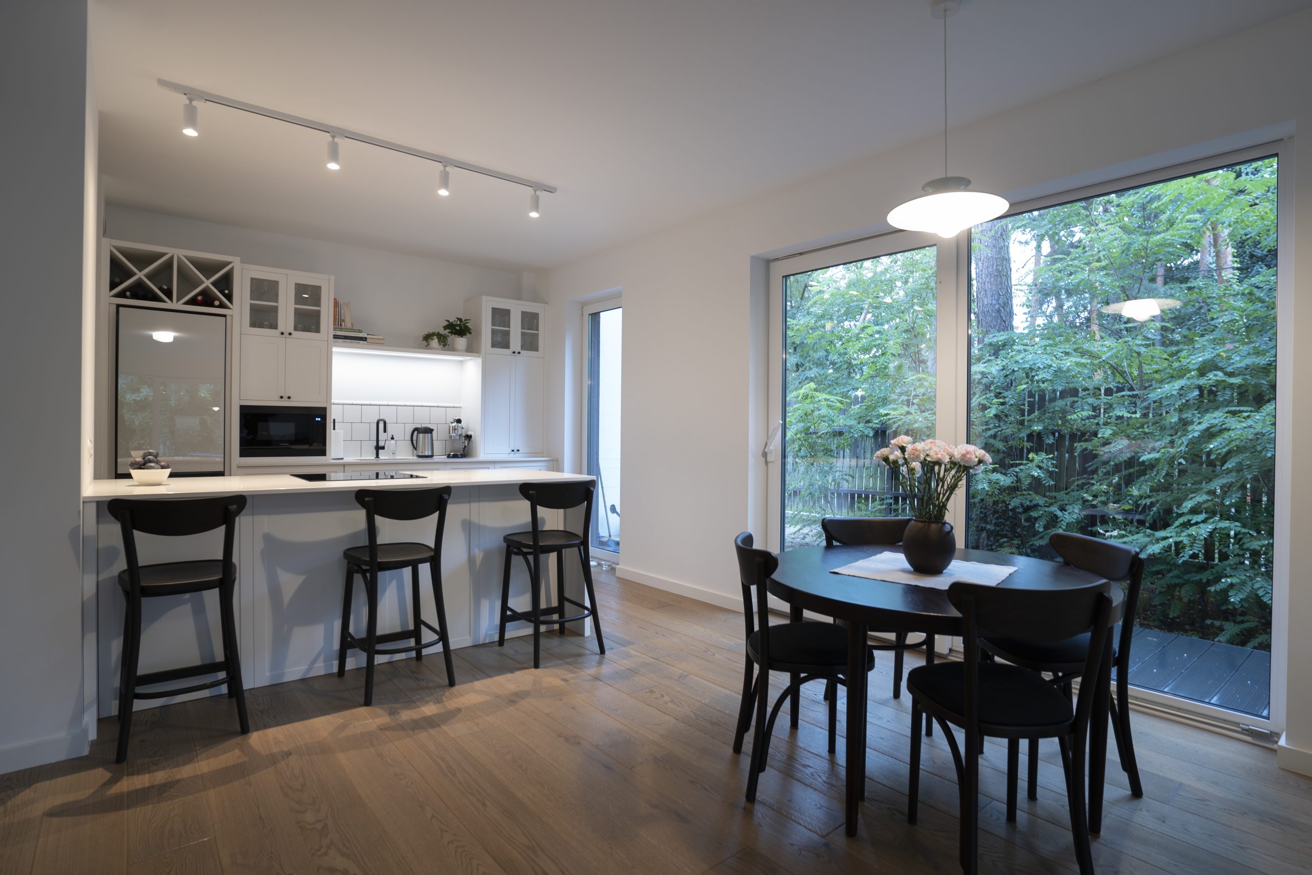 Dom w Józefowie to harmonijna, pełna światła przestrzeń, która zachwyca prostotą i elegancją. Jasna kuchnia z frezowanymi frontami, fornirowane akcenty w łazienkach i sypialni, spójne szafy i starannie dopracowane detale – to wszystko tworzy przytulny, ale wyrafinowany klimat. Klient zyskał przestrzeń funkcjonalną, ciepłą i ponadczasową, w której każdy element ma swoje miejsce. Dla nas to kolejna realizacja, w której mogliśmy pokazać, jak precyzja wykonania i szacunek do projektu architektonicznego przekładają się na satysfakcję klienta i piękne wnętrze.