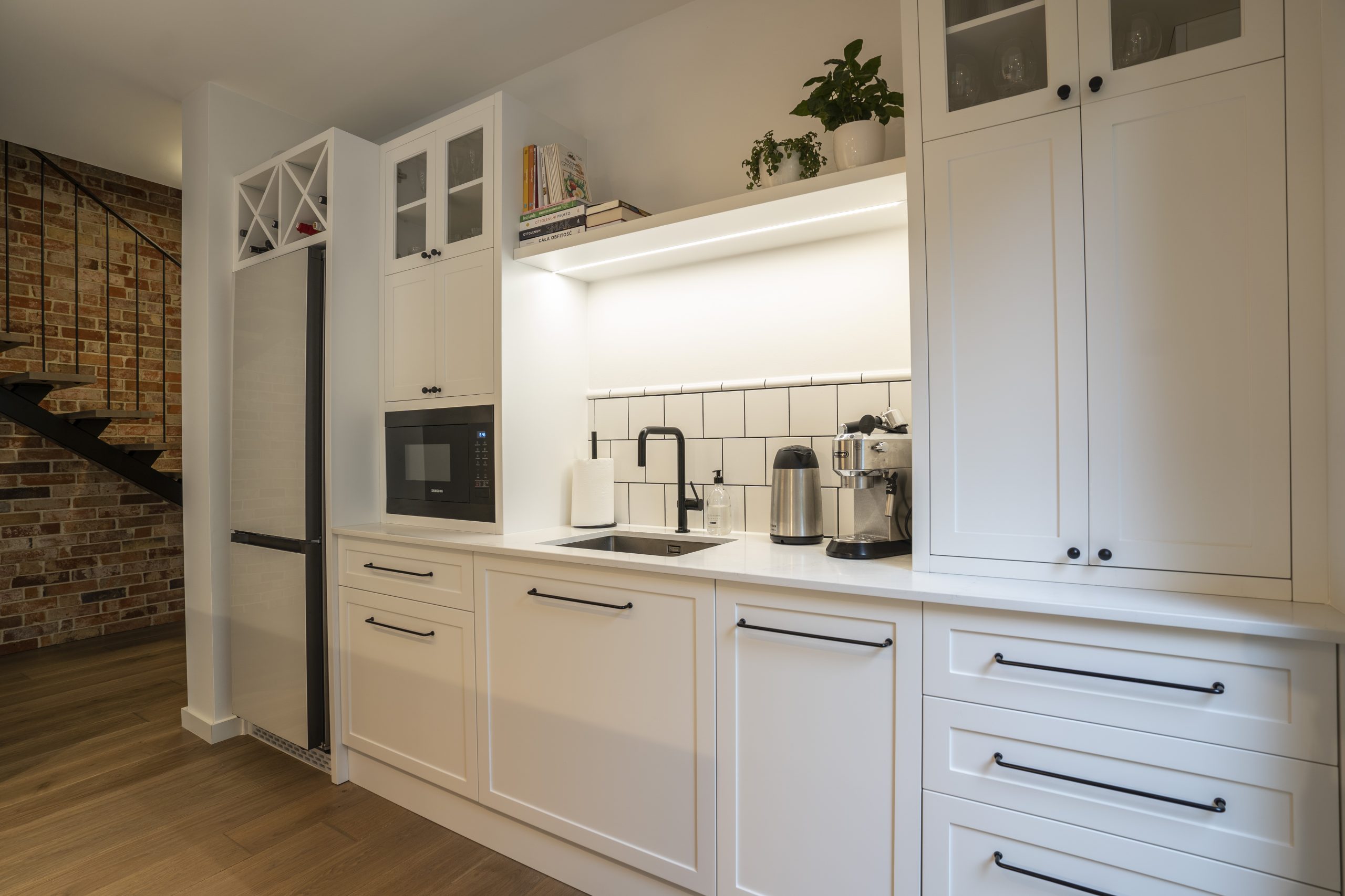 Nad lodówką zaprojektowaliśmy winiarkę z lakierowanych płyt, co dodało całości lekkości i smaku.
