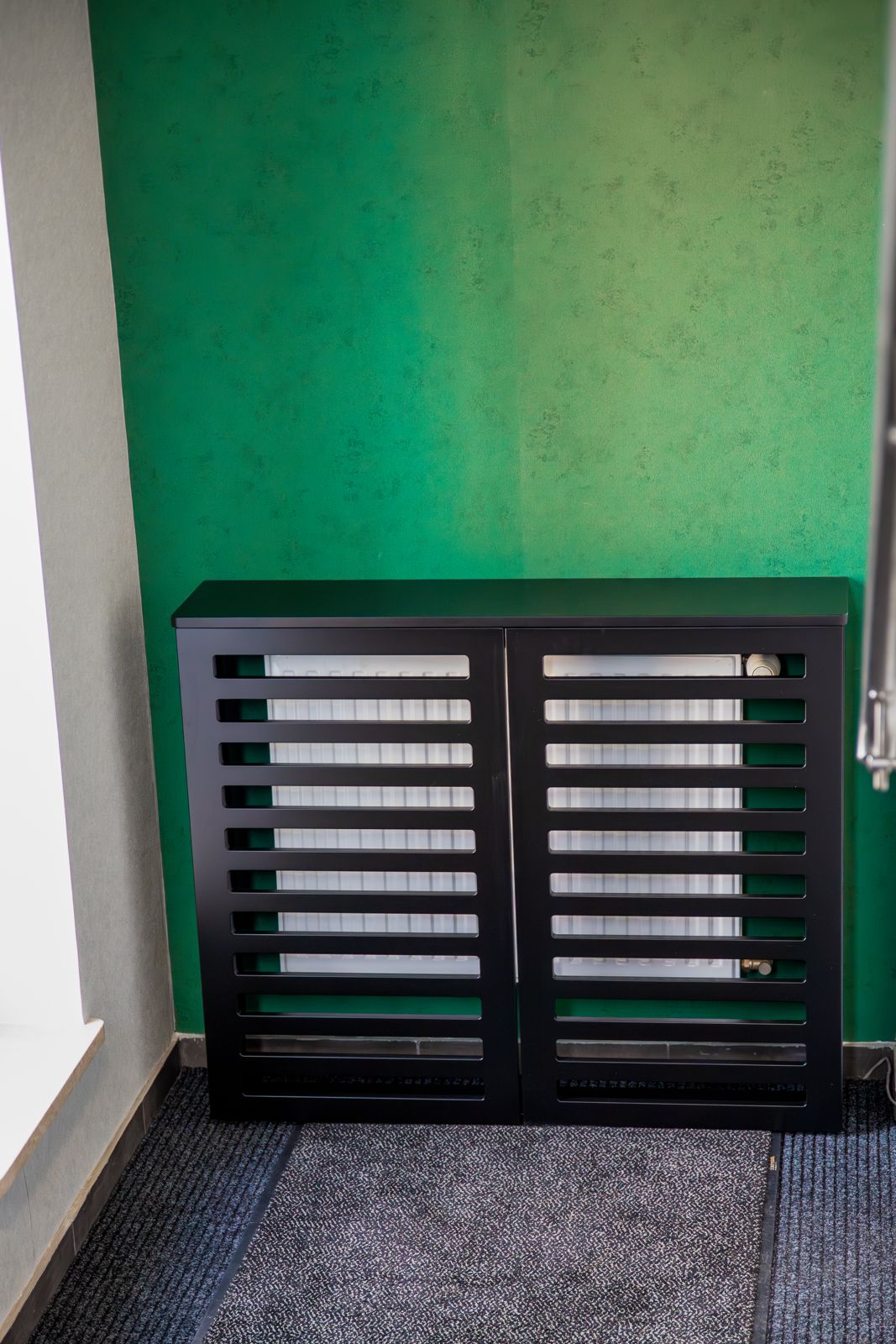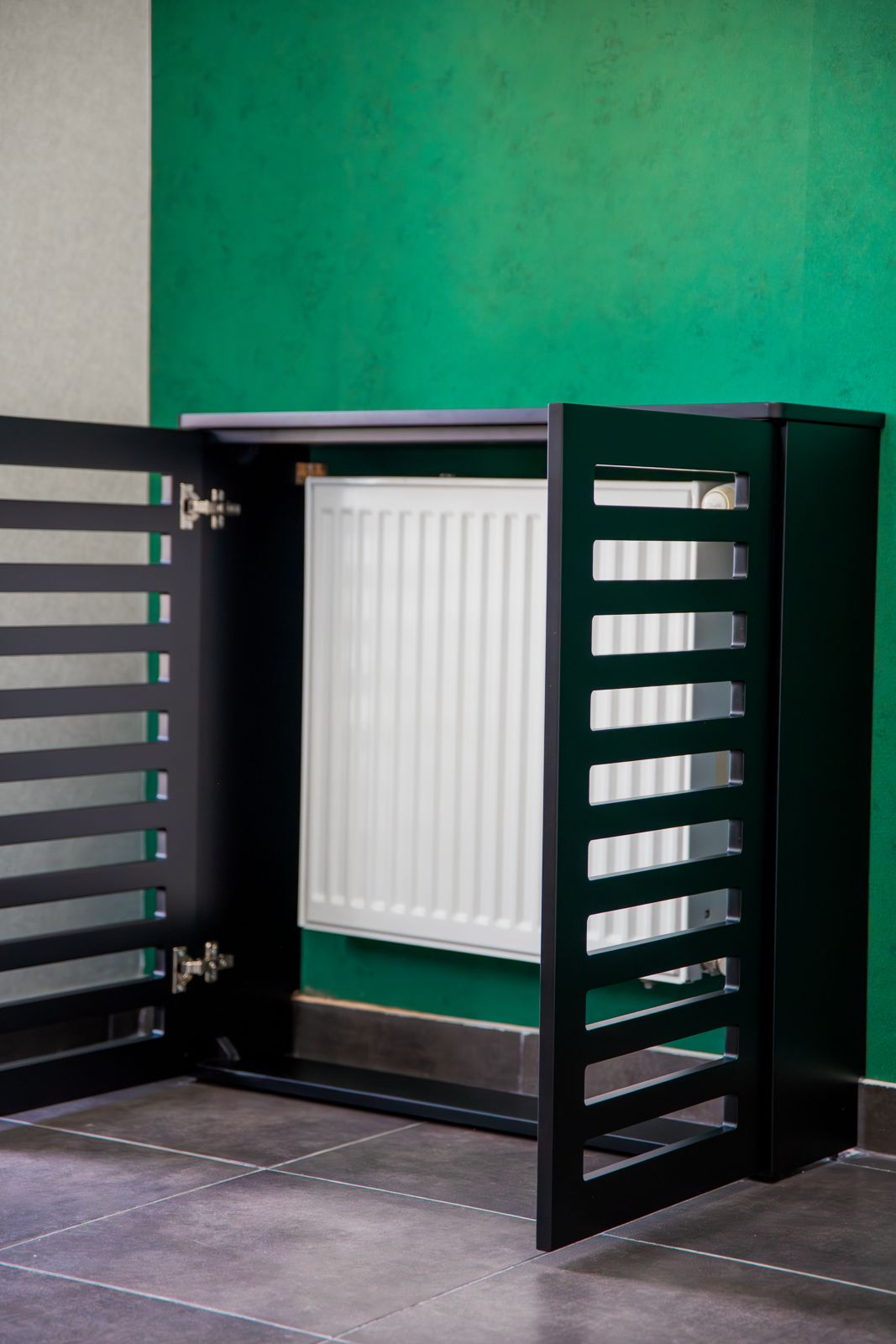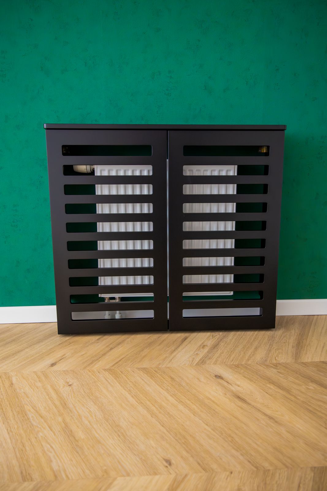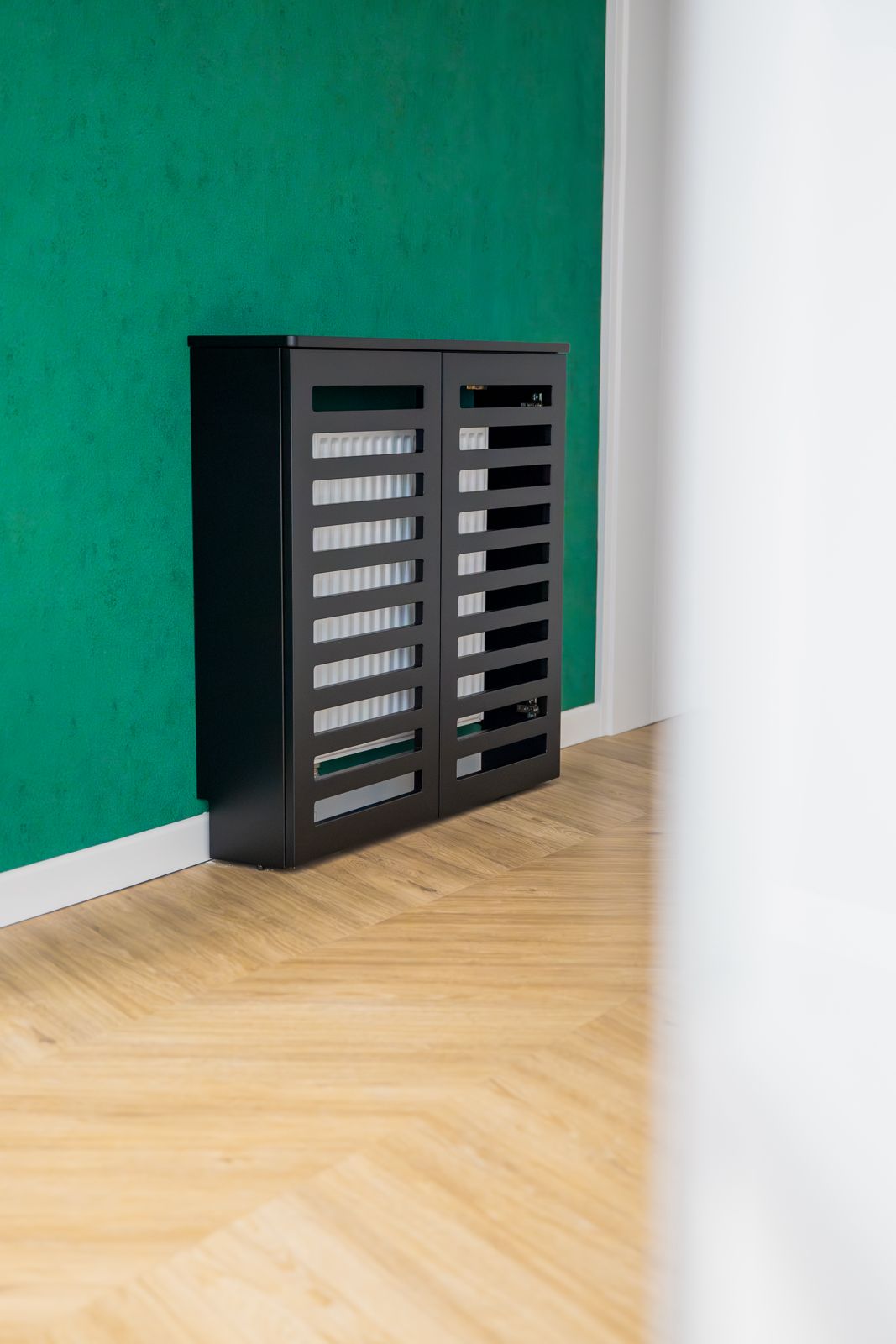 - Czarny lakier matowy – w zabudowach grzejników i wykończeniach, nadający wnętrzu nowoczesnego charakteru,
