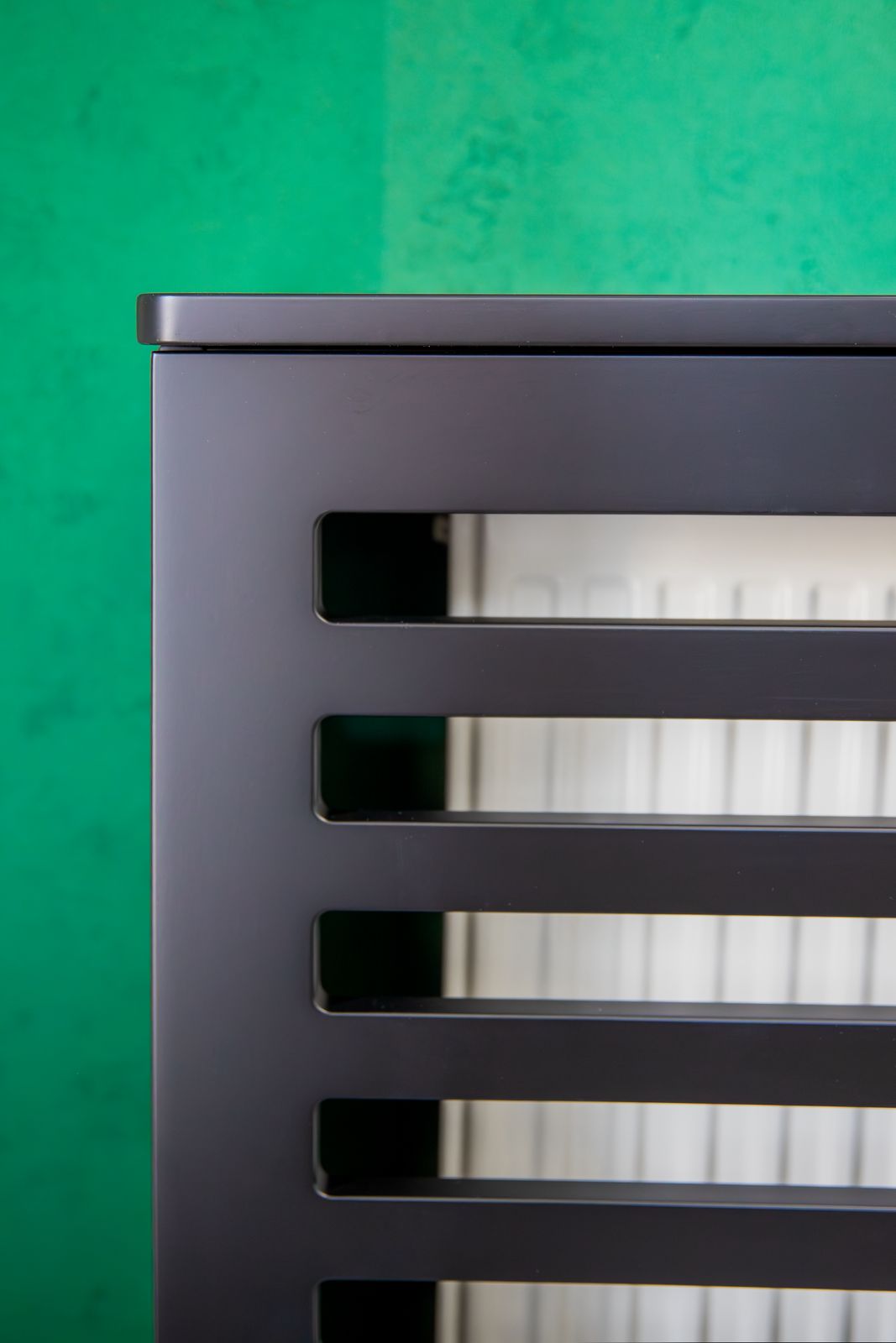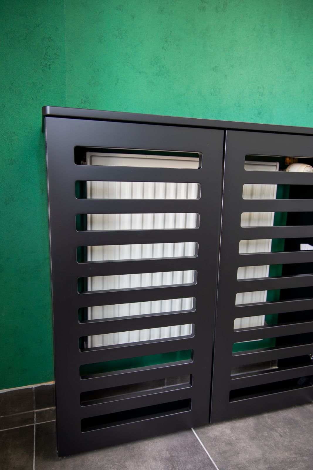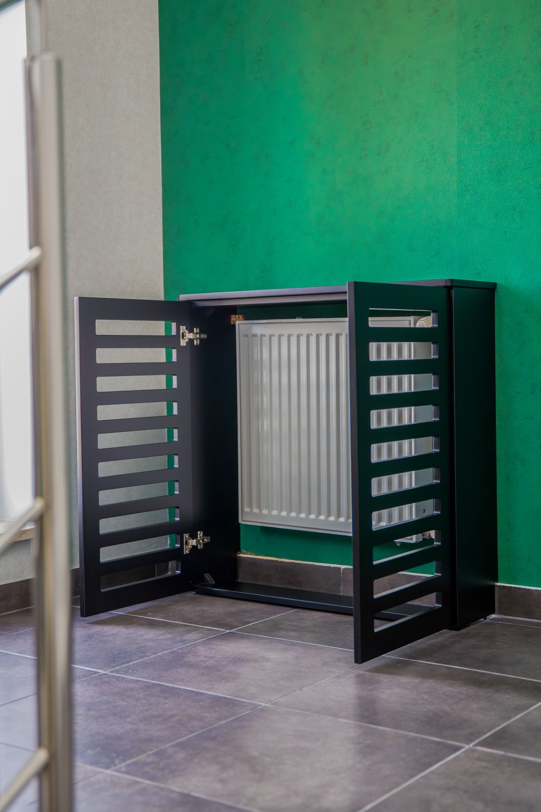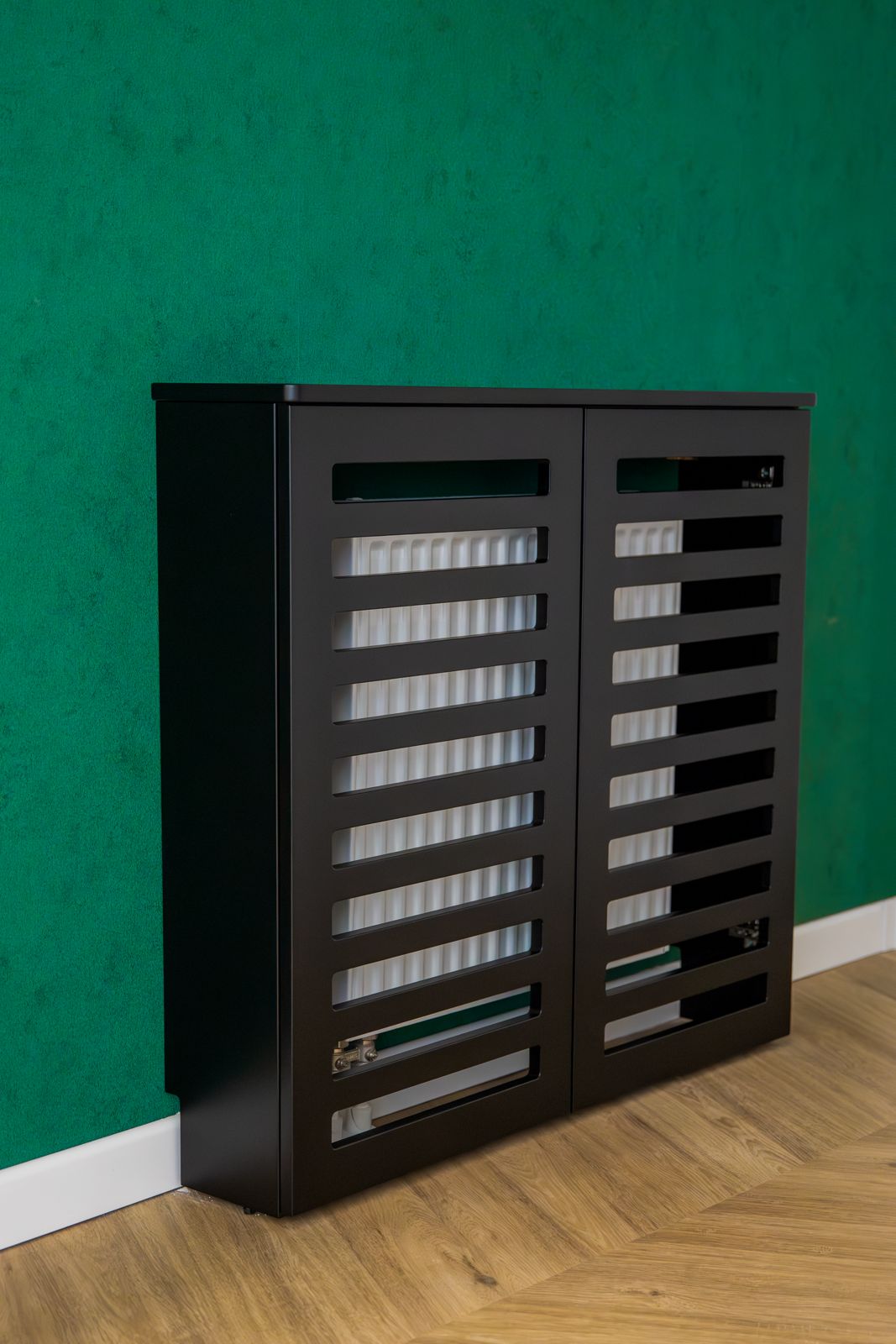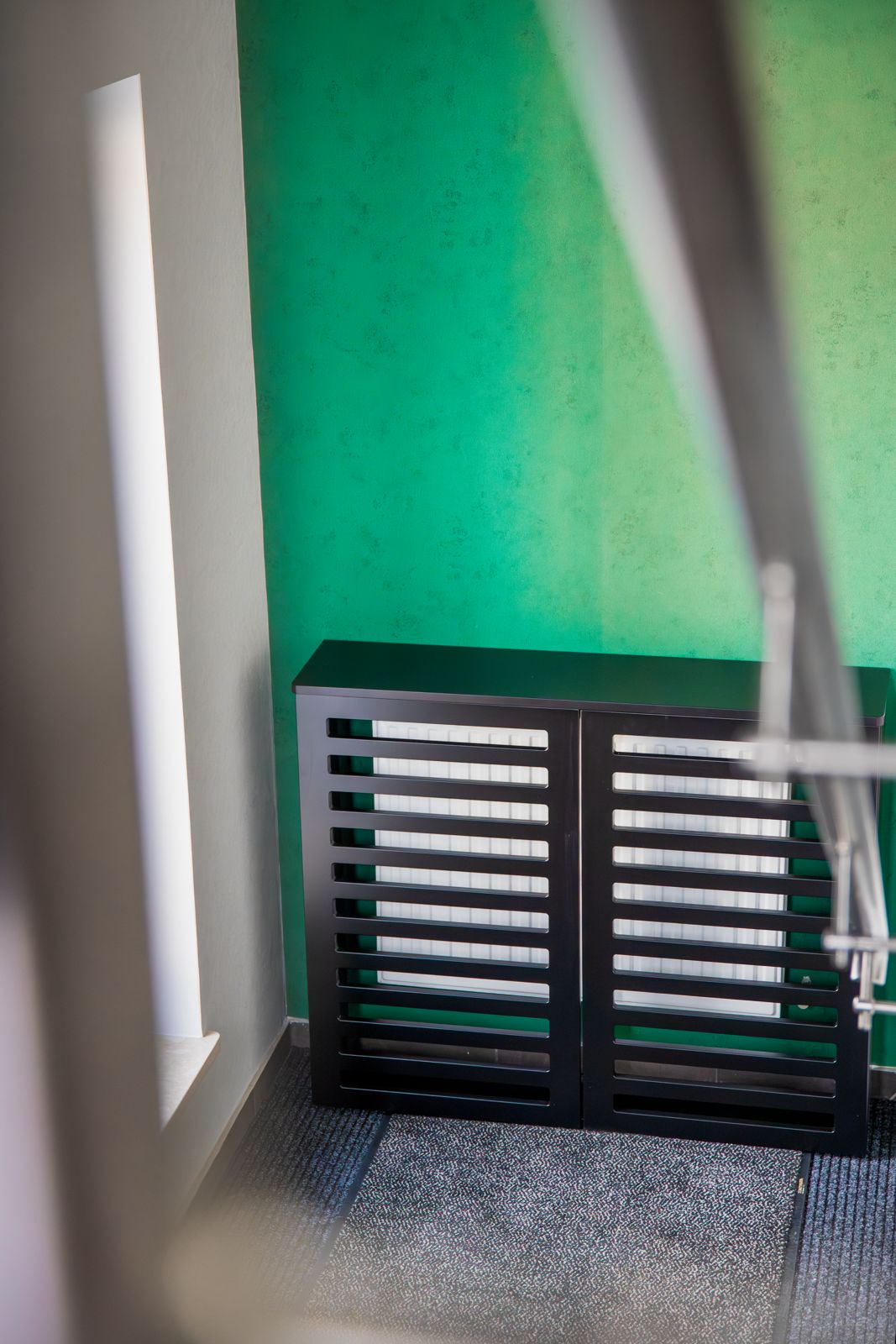 - Czarny lakier matowy – w zabudowach grzejników i wykończeniach, nadający wnętrzu nowoczesnego charakteru,