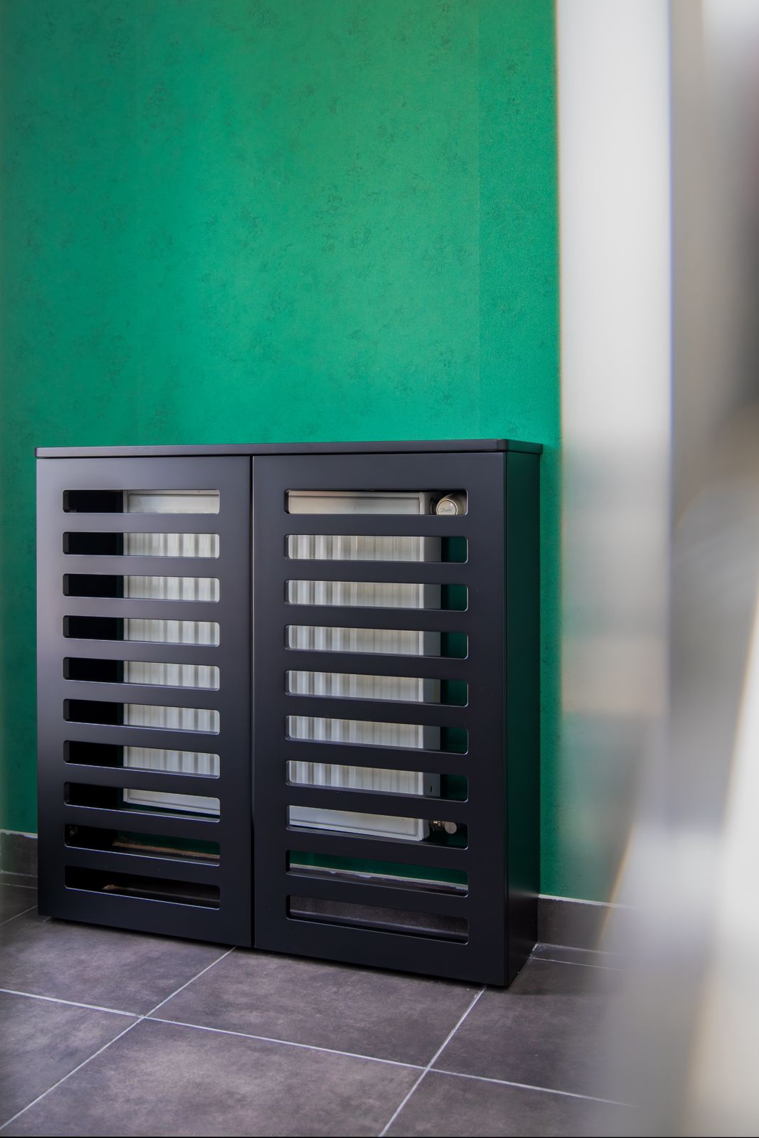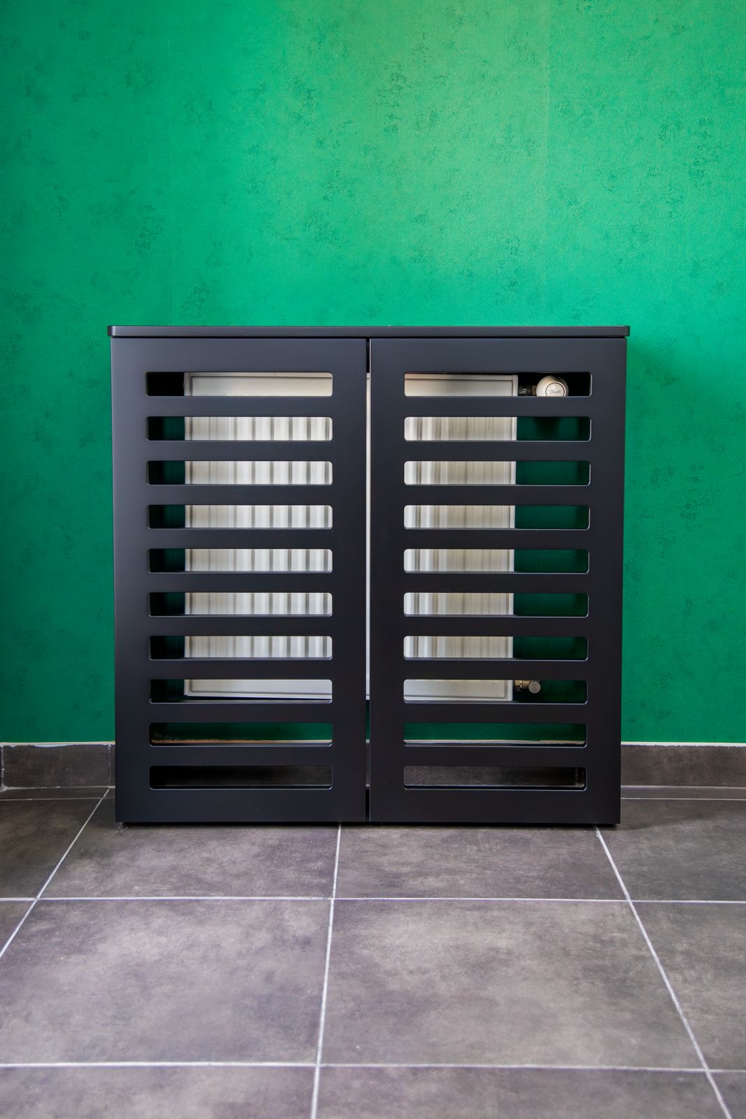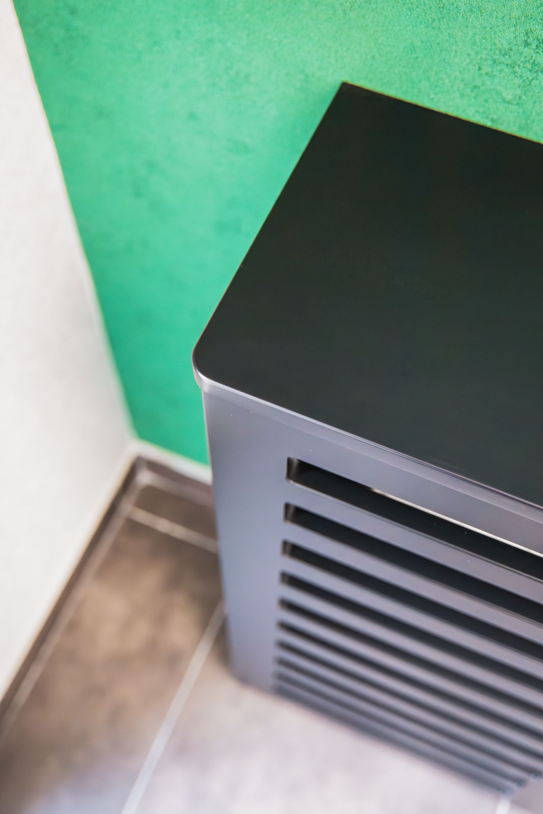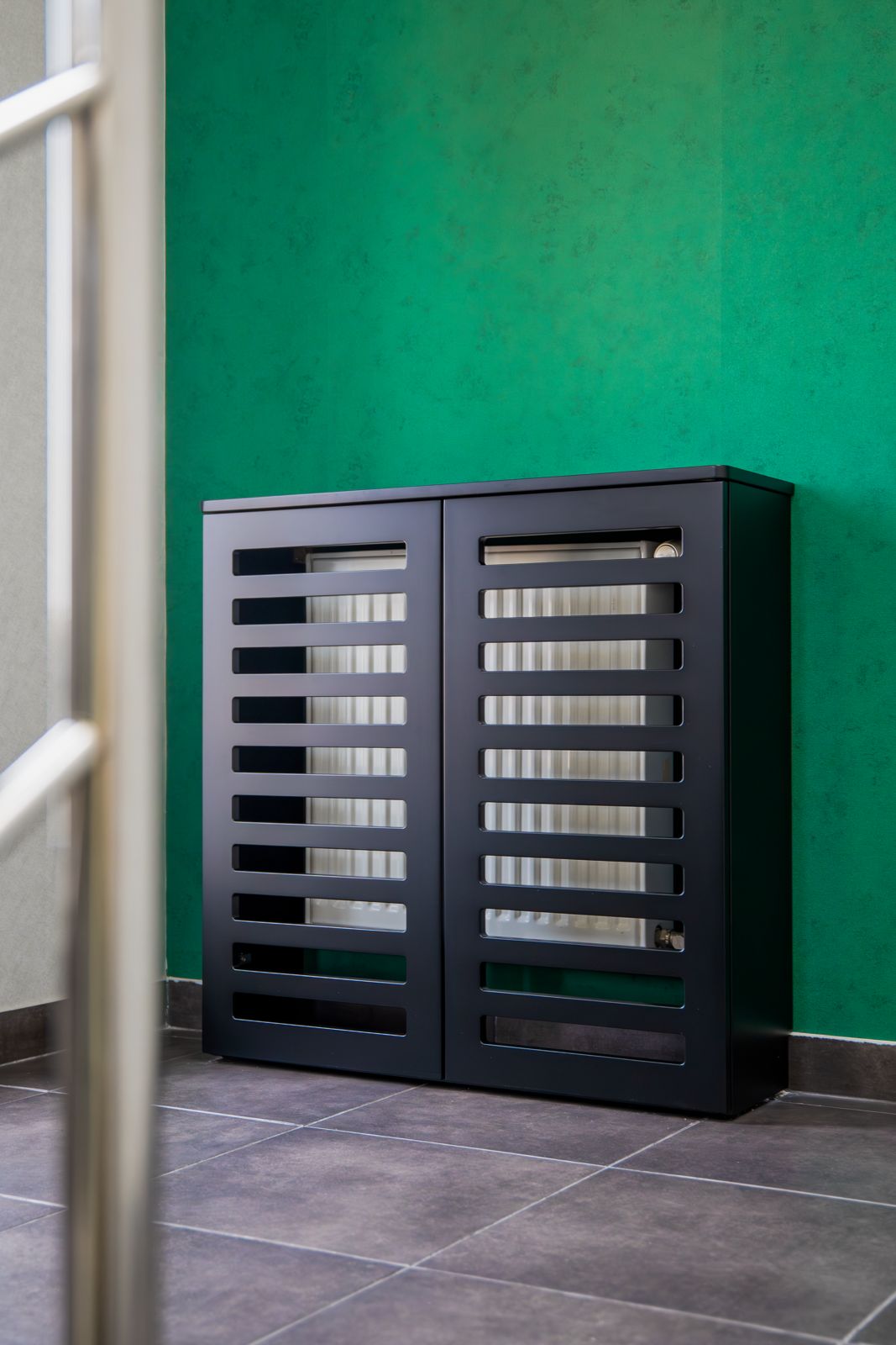 - Czarny lakier matowy – w zabudowach grzejników i wykończeniach, nadający wnętrzu nowoczesnego charakteru,