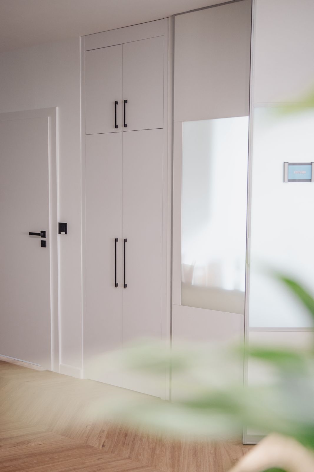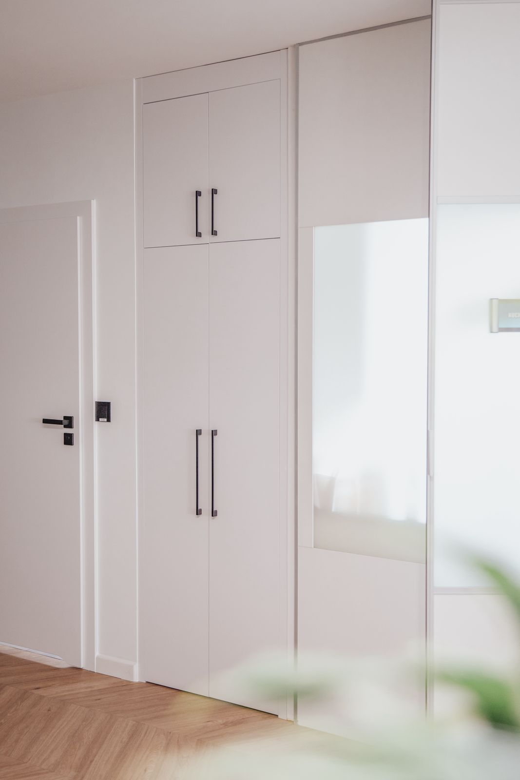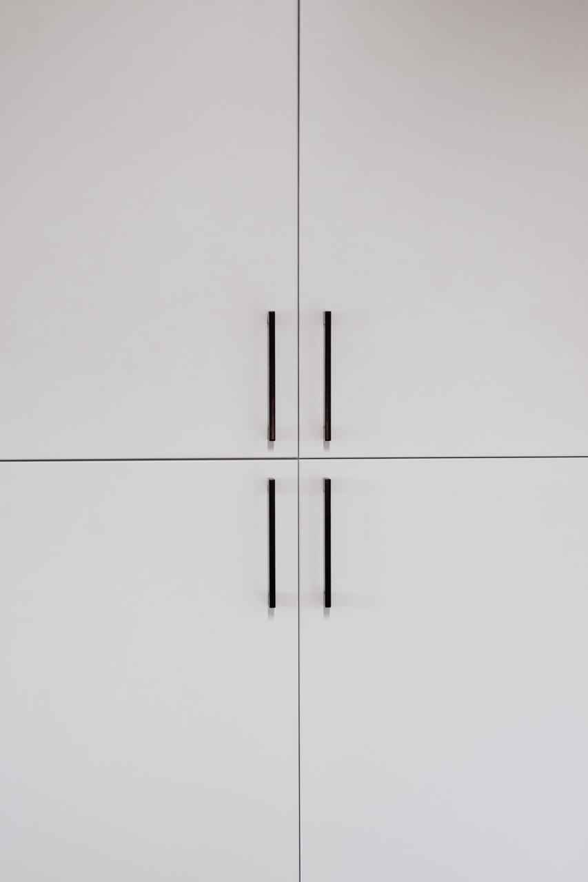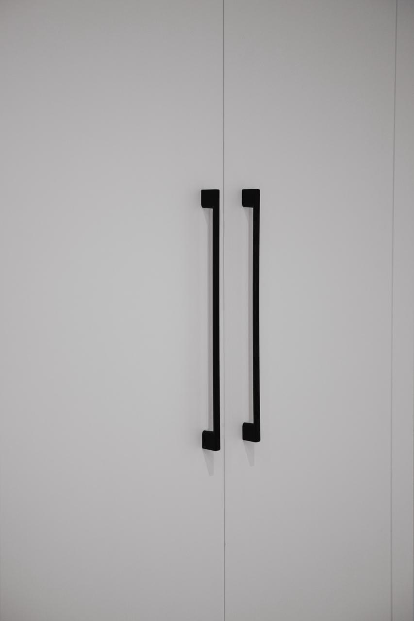 - dużą białą szafę z pionowymi, czarnymi uchwytami,