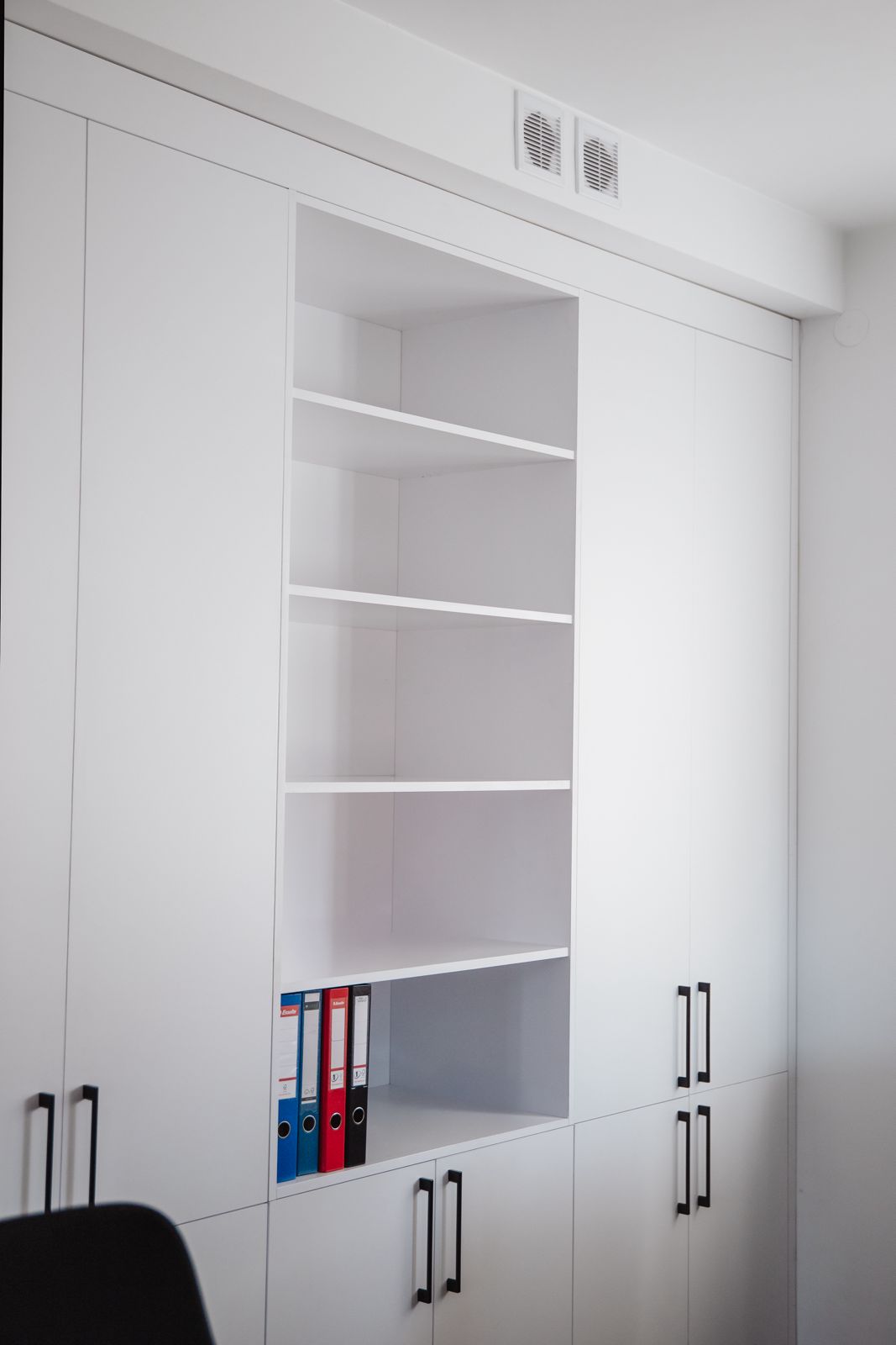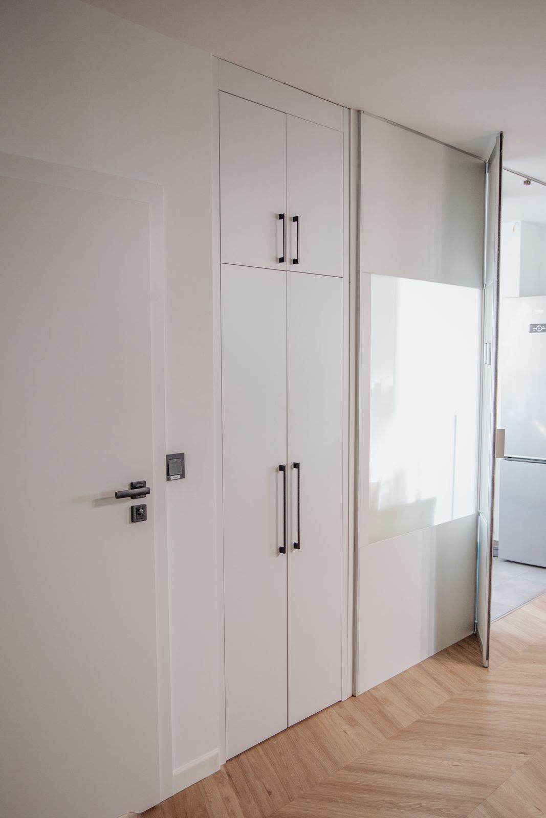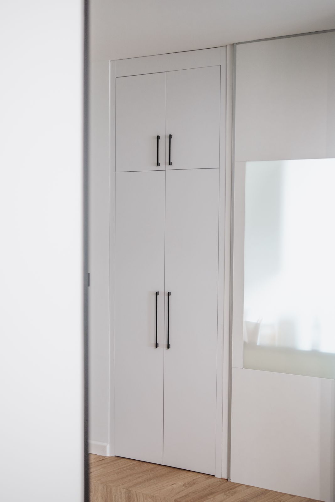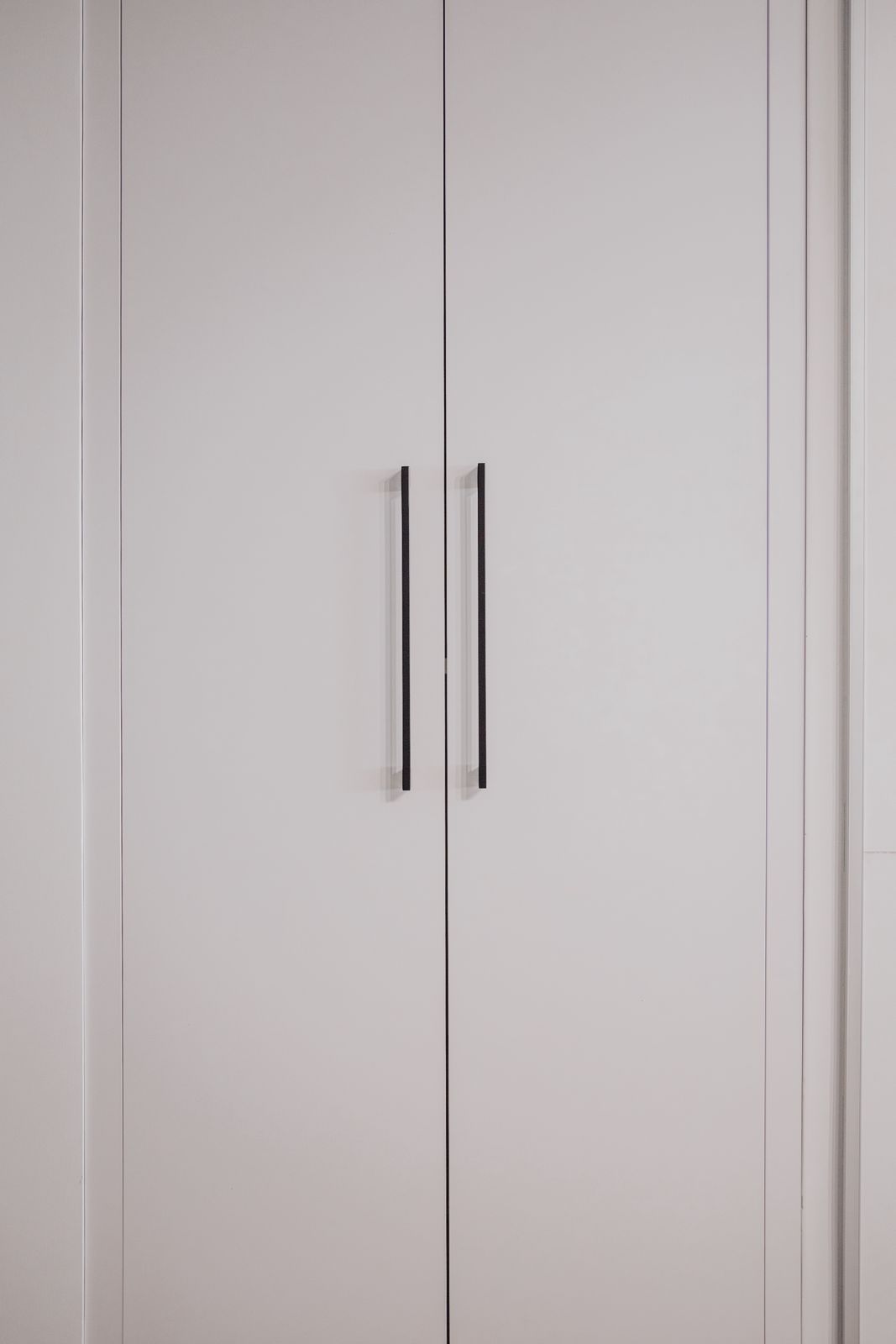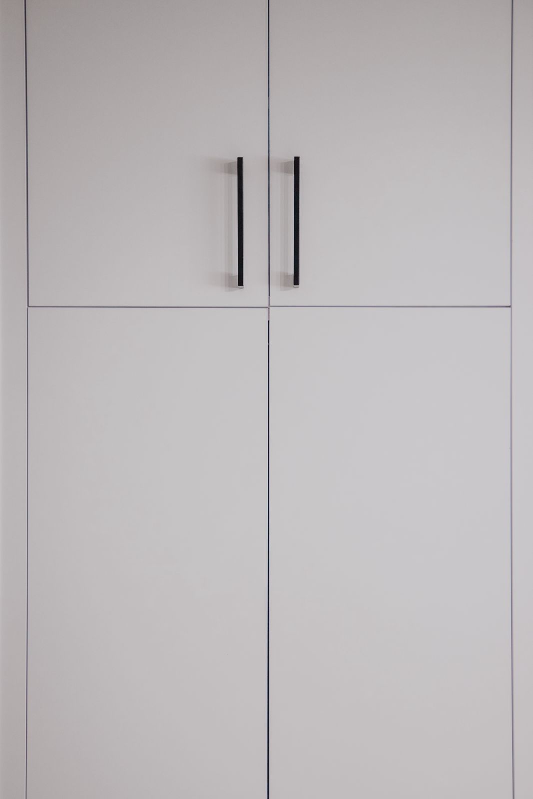 - dużą białą szafę z pionowymi, czarnymi uchwytami,