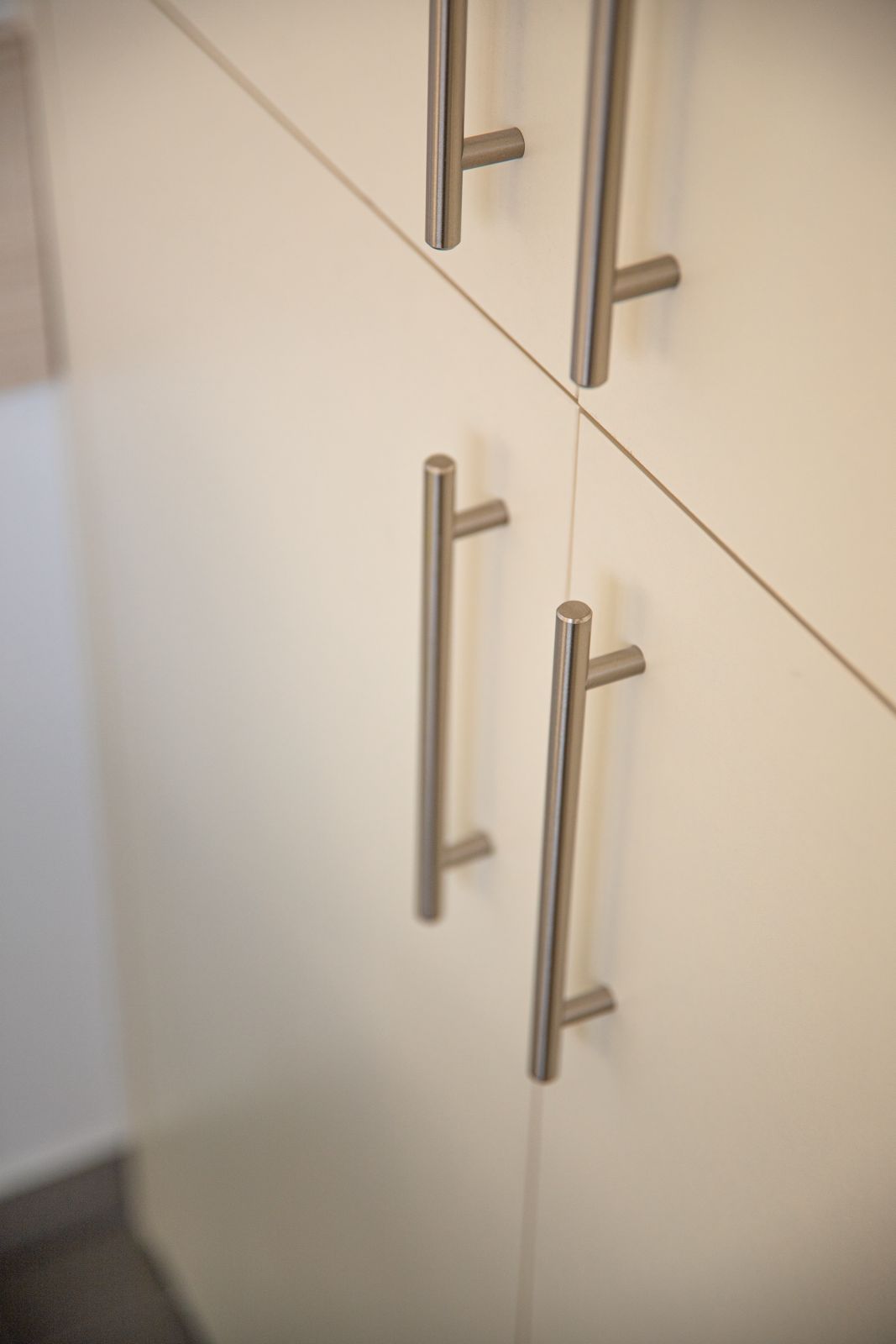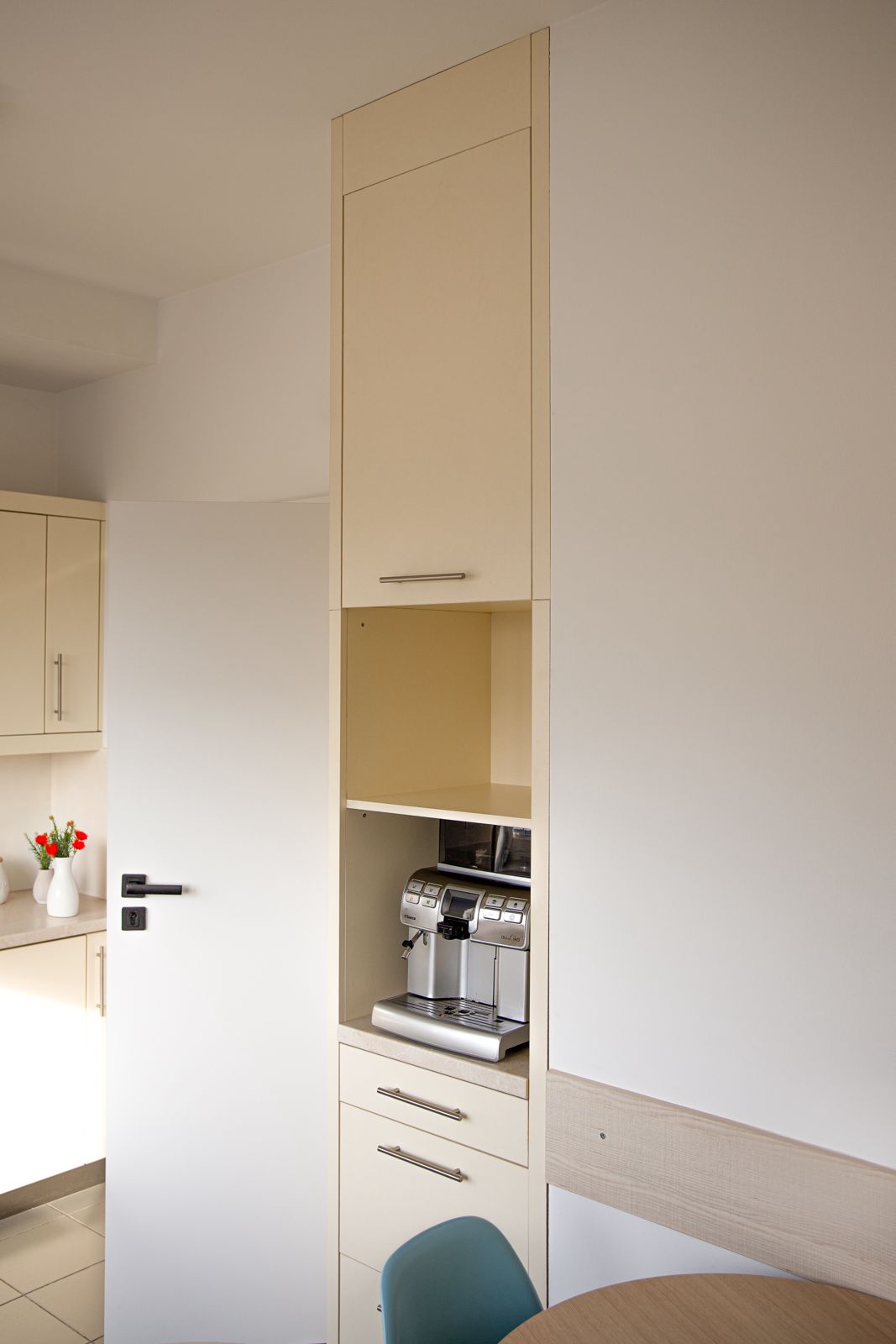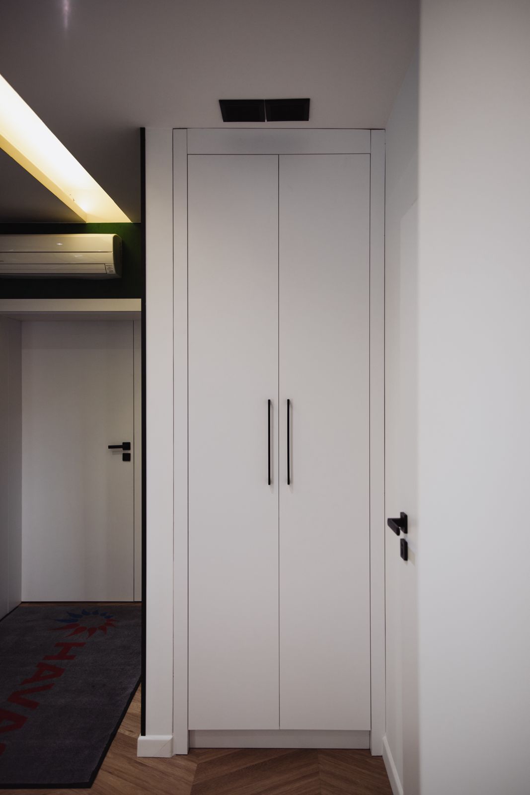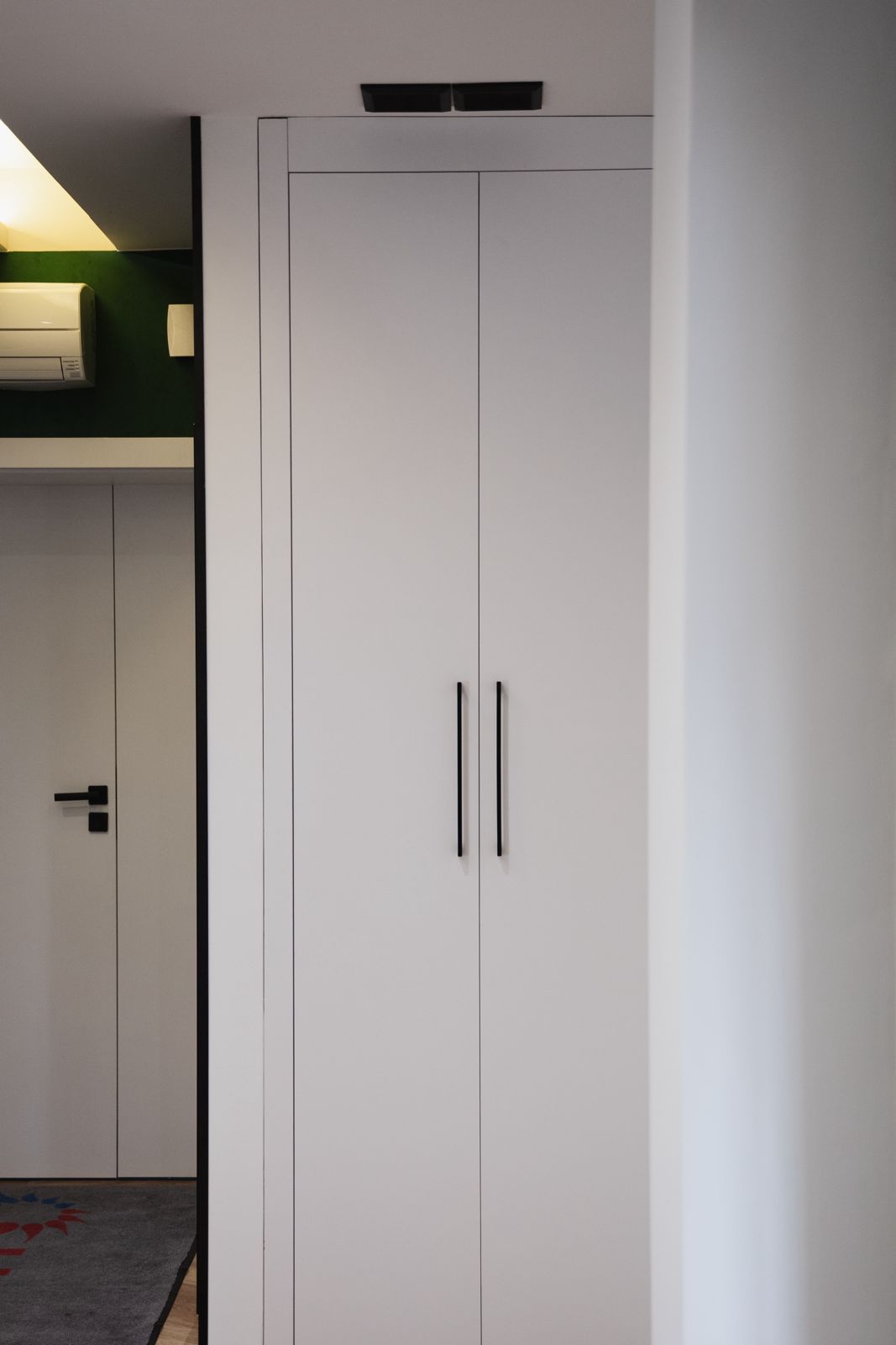 - dużą białą szafę z pionowymi, czarnymi uchwytami,