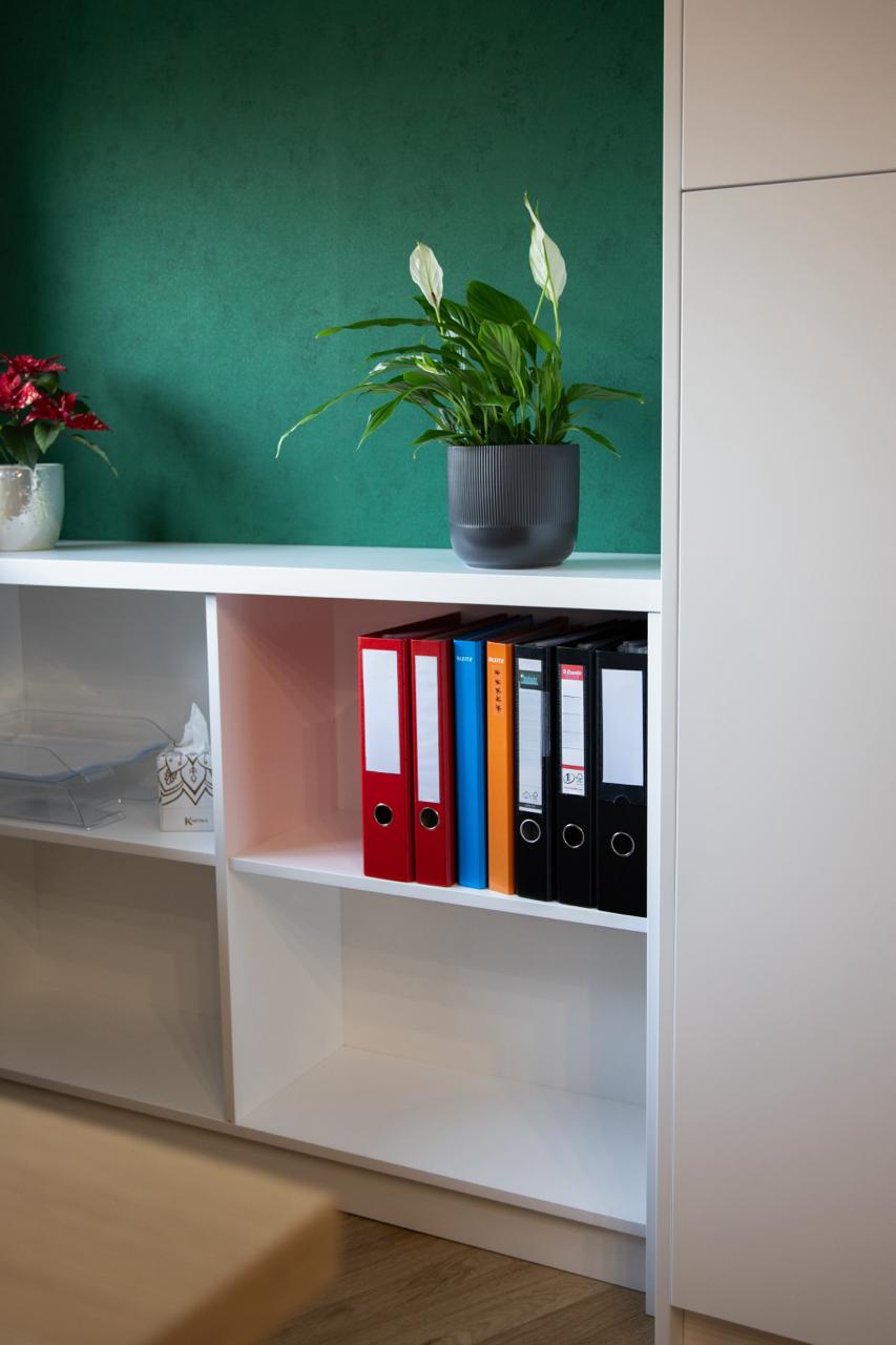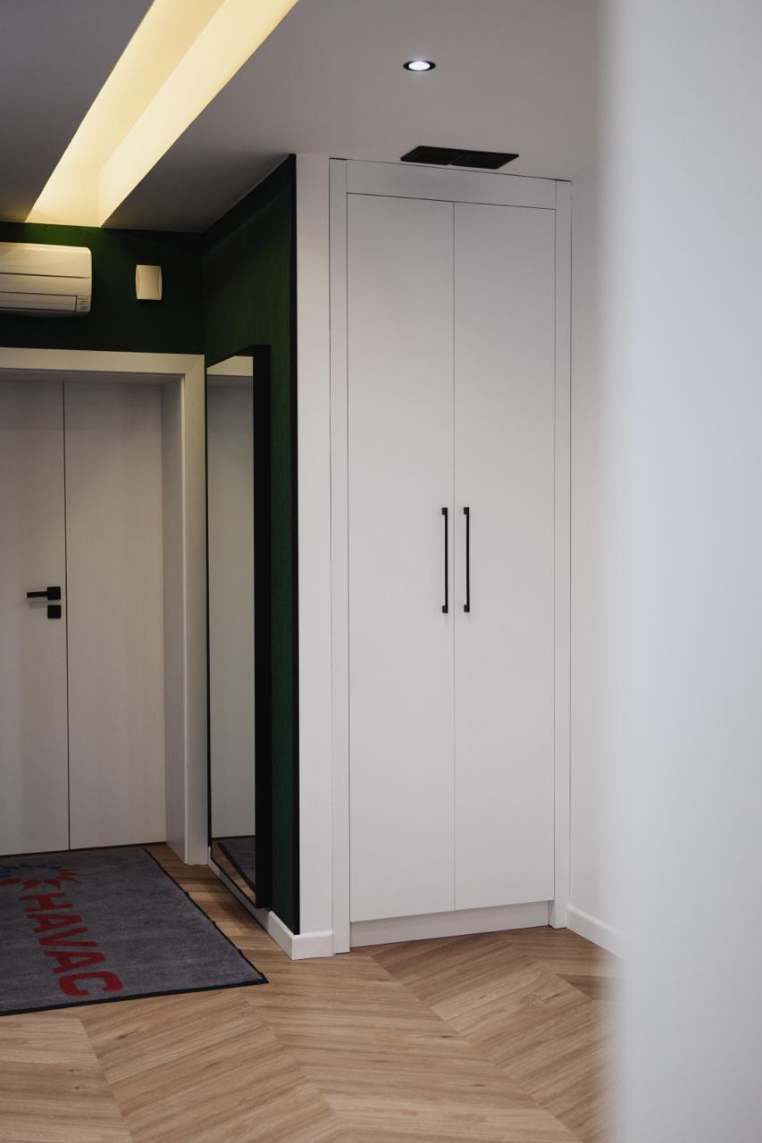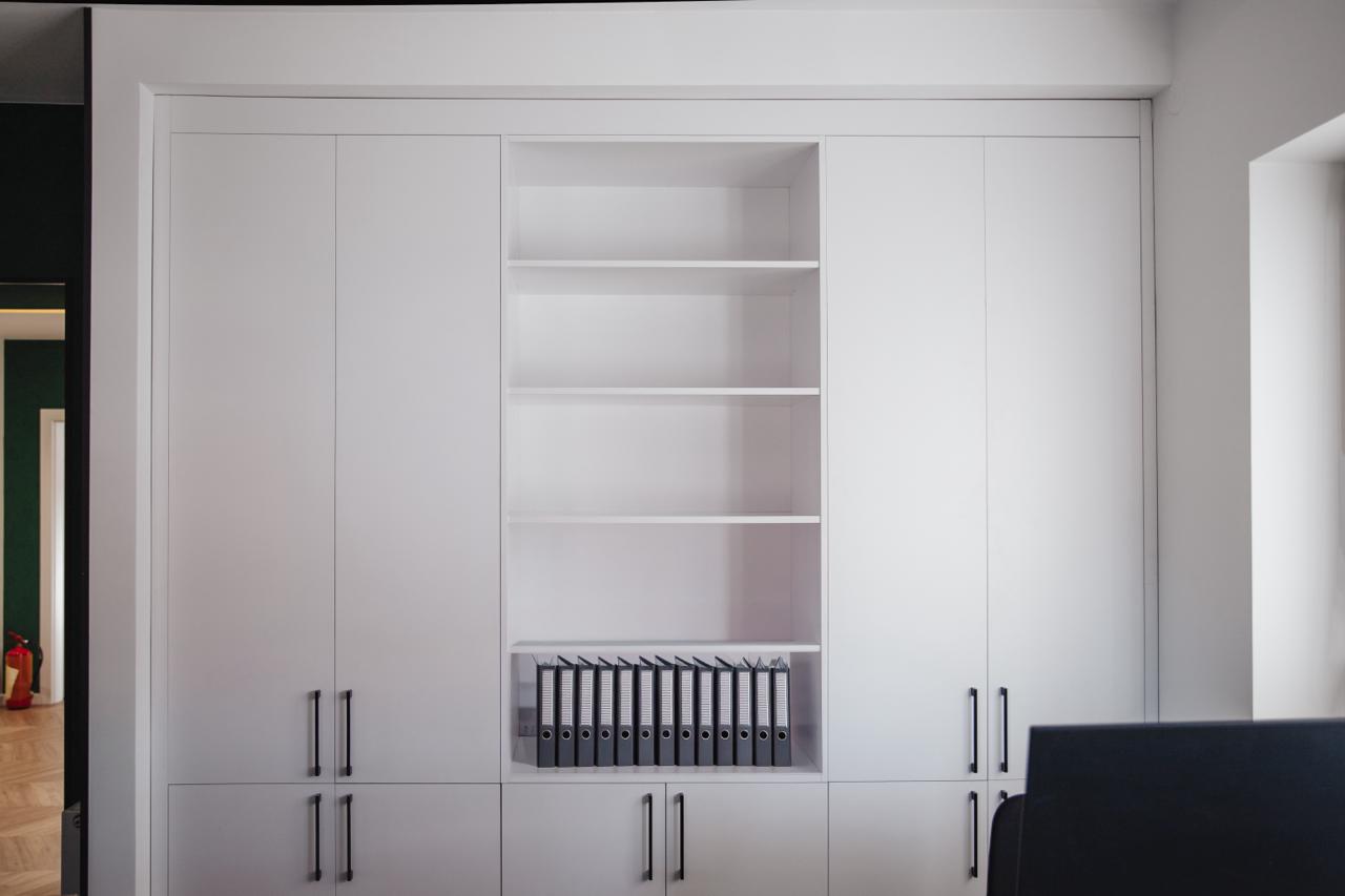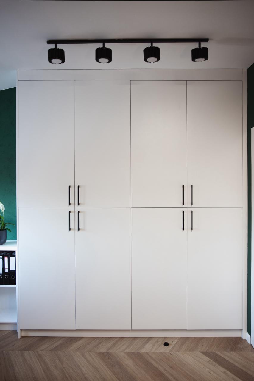 Inwestor oczekiwał, aby meble biurowe na wymiar nie były typowe – miały odznaczać się prestiżem, jakością i nietuzinkowym wykończeniem. Standardowe laminaty biurowe nie wchodziły w grę – zamiast tego klient zdecydował się na lakierowane meble na wymiar, które rzadko spotyka się w przestrzeniach biurowych. Dodatkowo potrzebne były różne typy zabudów – od dużych szaf na dokumenty i segregatory, przez szafę w wiatrołapie na odzież, aż po funkcjonalną zabudowę kuchenną i łazienkową. Każdy mebel musiał być dopasowany zarówno do pomieszczenia, jak i codziennych potrzeb pracowników.