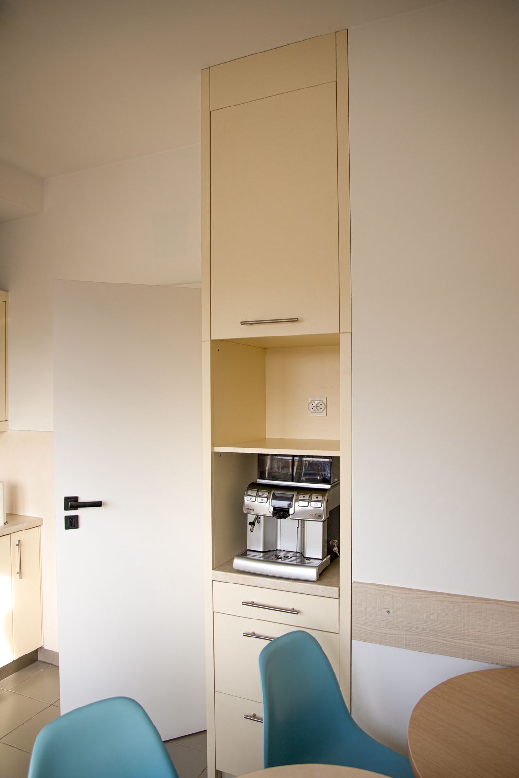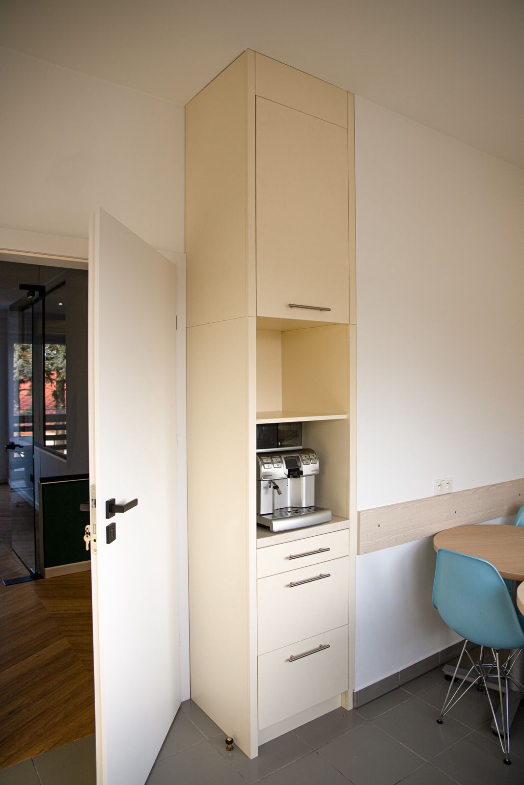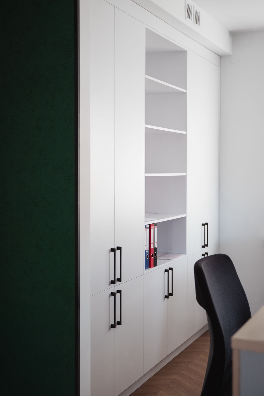 Inwestor oczekiwał, aby meble biurowe na wymiar nie były typowe – miały odznaczać się prestiżem, jakością i nietuzinkowym wykończeniem. Standardowe laminaty biurowe nie wchodziły w grę – zamiast tego klient zdecydował się na lakierowane meble na wymiar, które rzadko spotyka się w przestrzeniach biurowych. Dodatkowo potrzebne były różne typy zabudów – od dużych szaf na dokumenty i segregatory, przez szafę w wiatrołapie na odzież, aż po funkcjonalną zabudowę kuchenną i łazienkową. Każdy mebel musiał być dopasowany zarówno do pomieszczenia, jak i codziennych potrzeb pracowników.