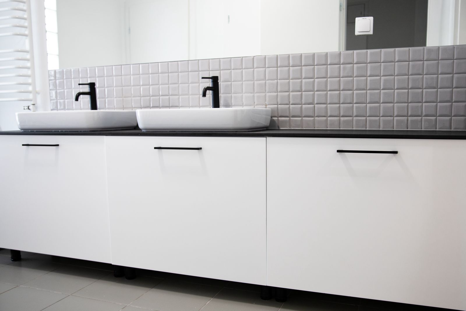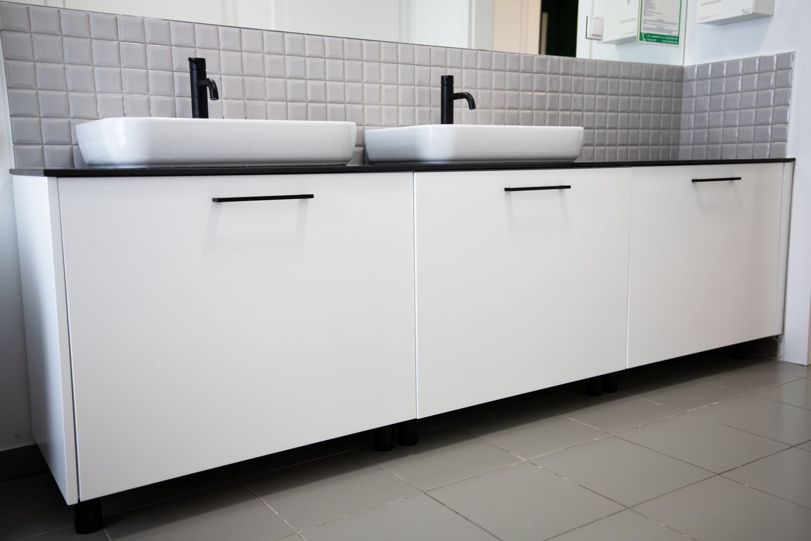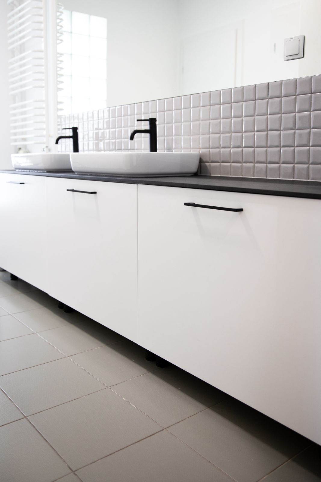 - Blat HPL czarny marmur – w zabudowie łazienkowej z dwiema umywalkami.