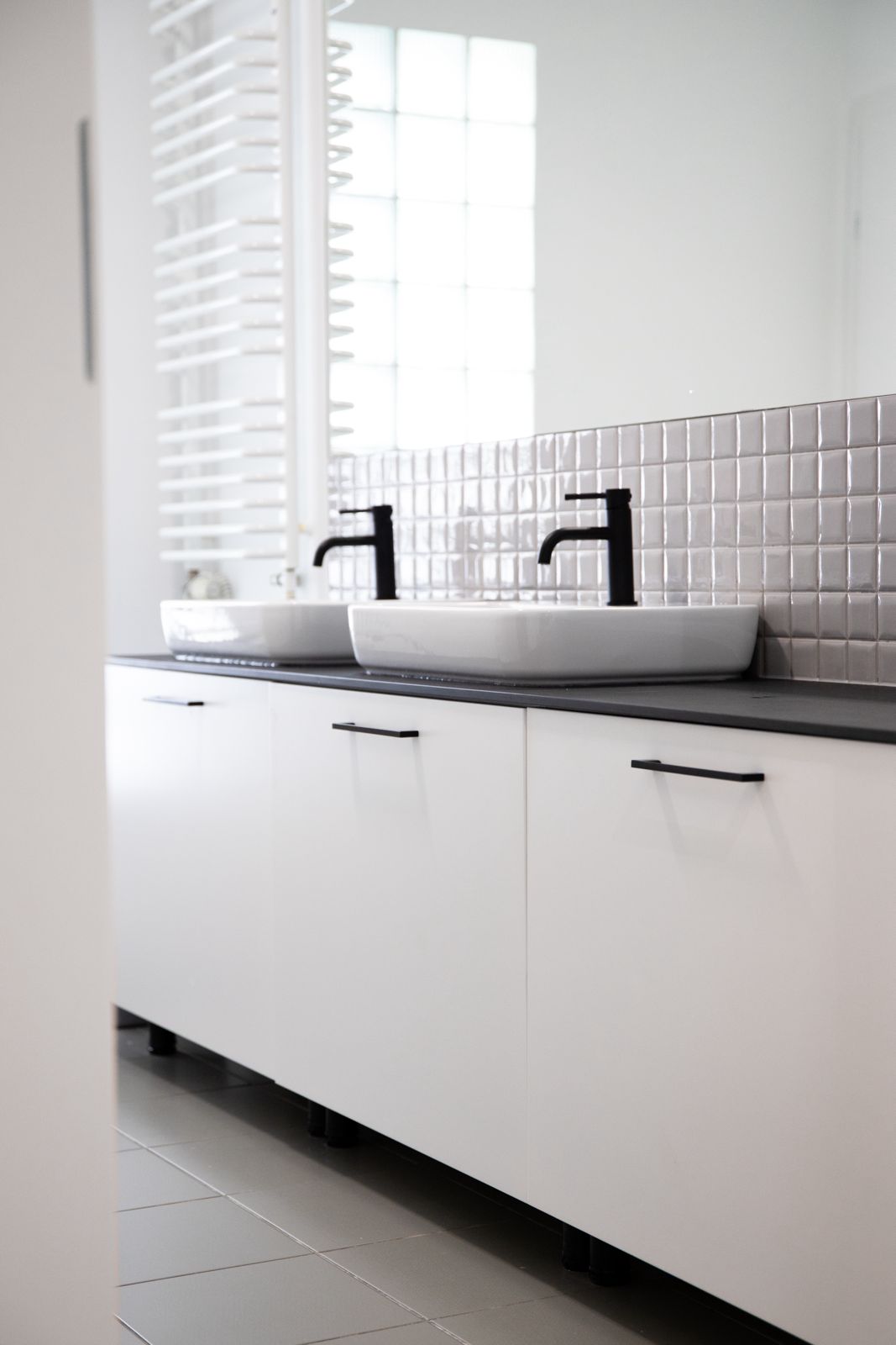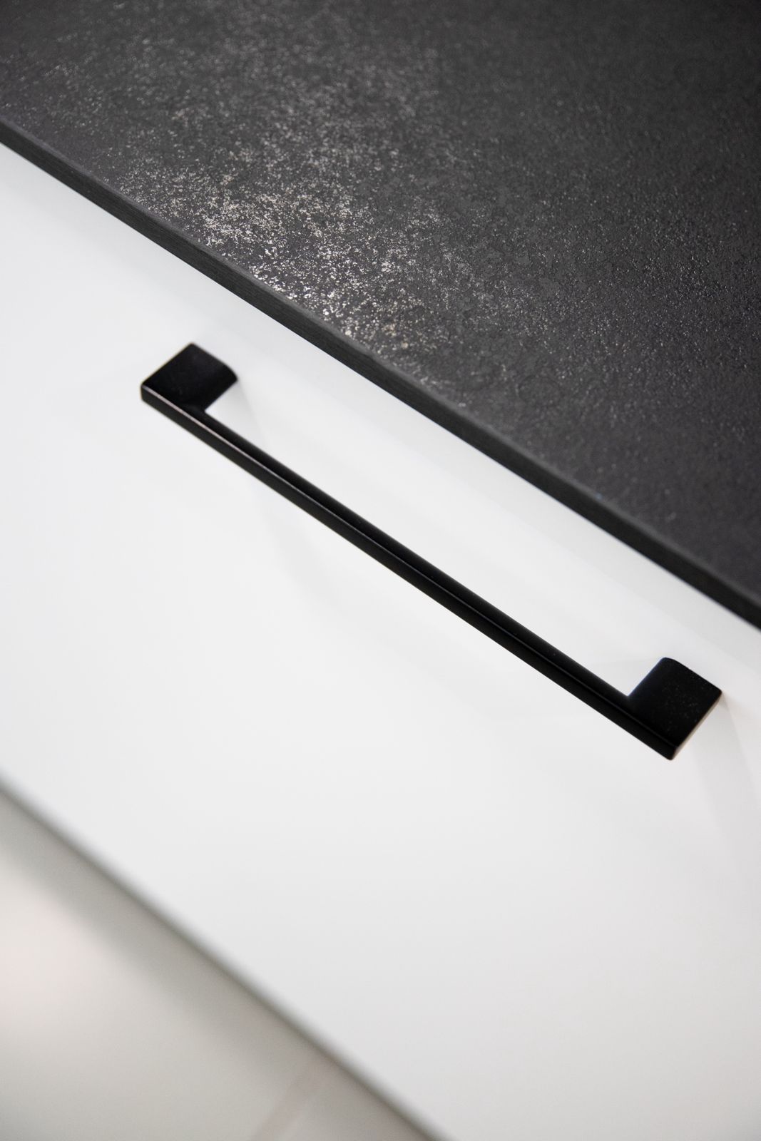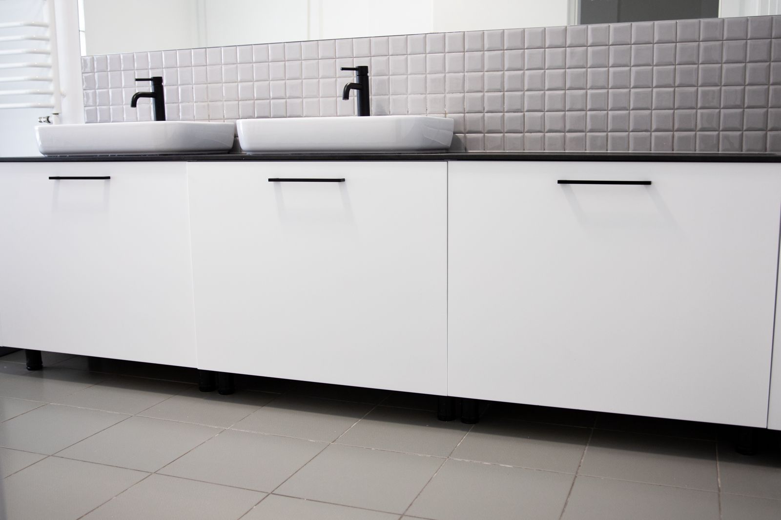 - Blat HPL czarny marmur – w zabudowie łazienkowej z dwiema umywalkami.