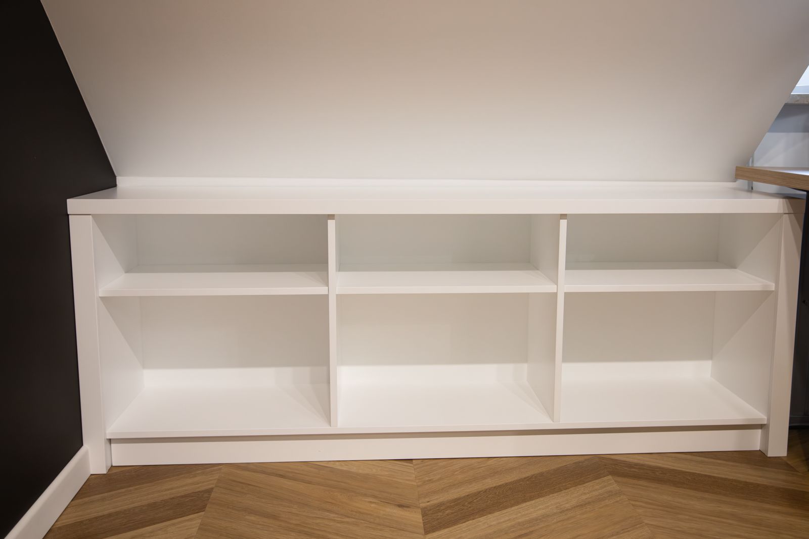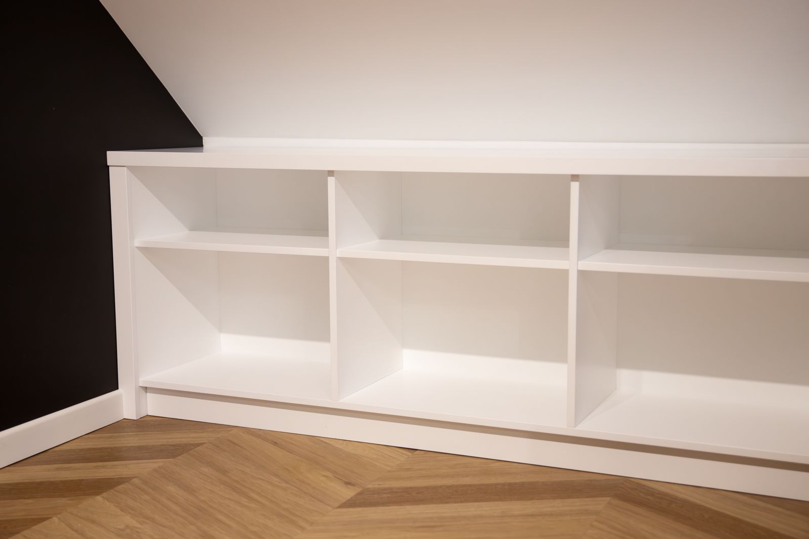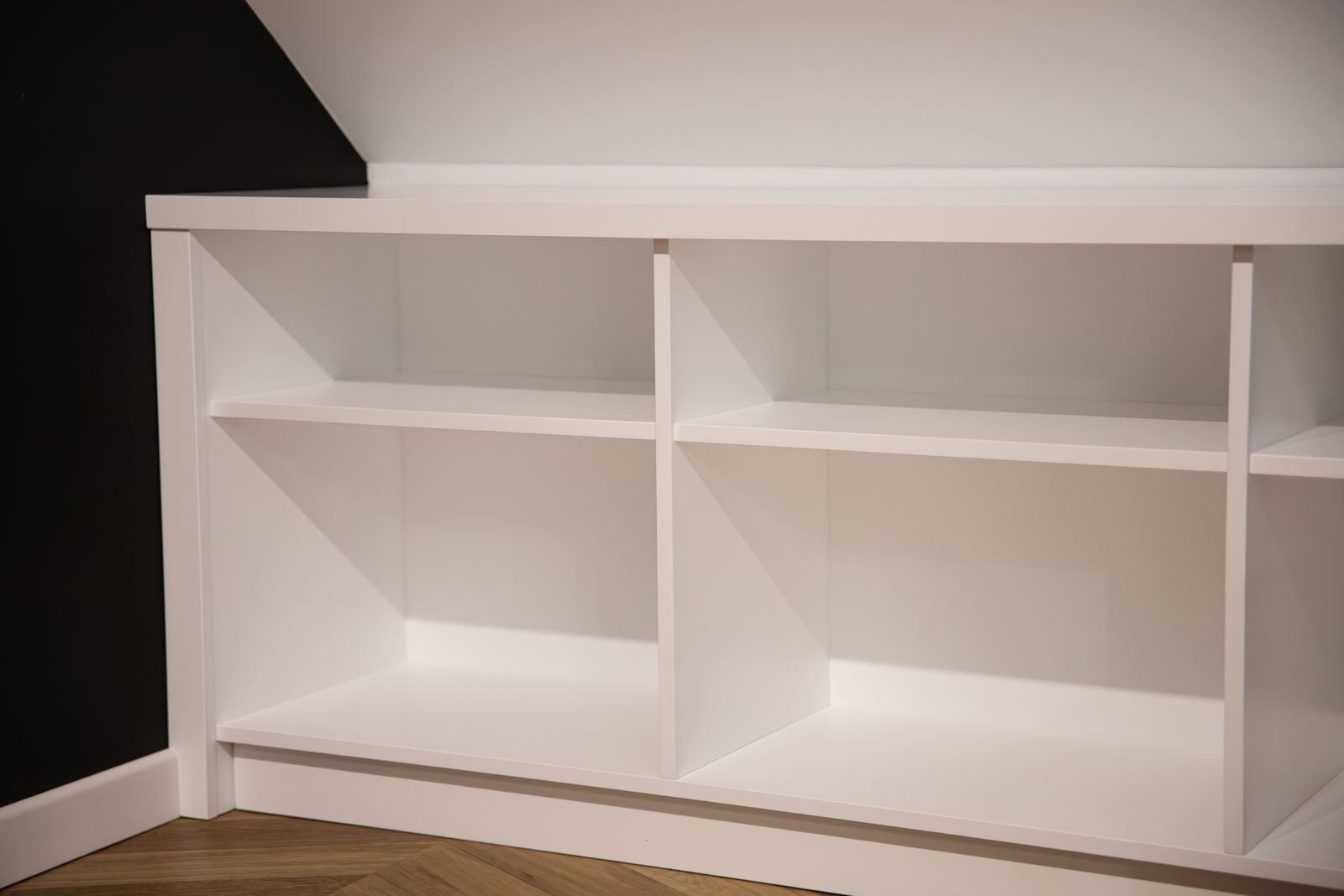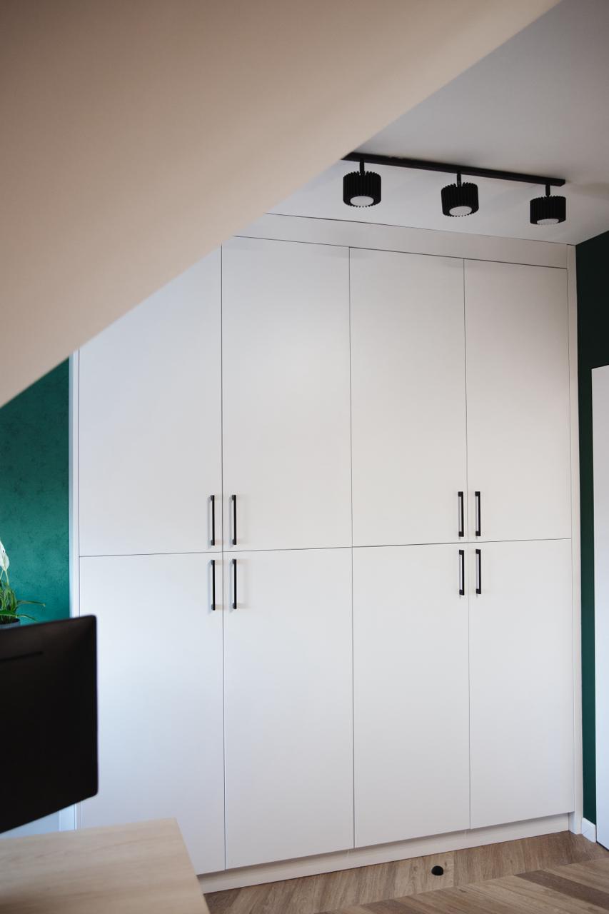 - Lakier biały mat – w zabudowach gabinetu i otwartych półkach pod skosami,