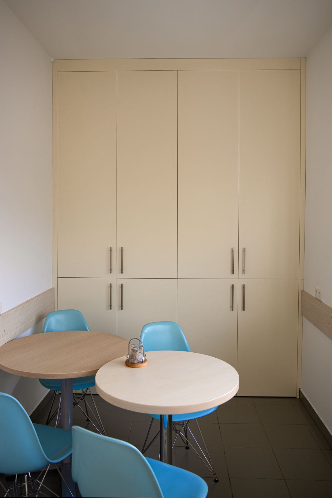Drugim wymagającym aspektem było dopasowanie mebli do niestandardowych przestrzeni – np. szafek ze skosami w gabinecie dyrektora. Takie rozwiązania rzadko stosuje się w biurach, ale w tym przypadku pozwoliły maksymalnie wykorzystać przestrzeń, jednocześnie zachowując elegancję.