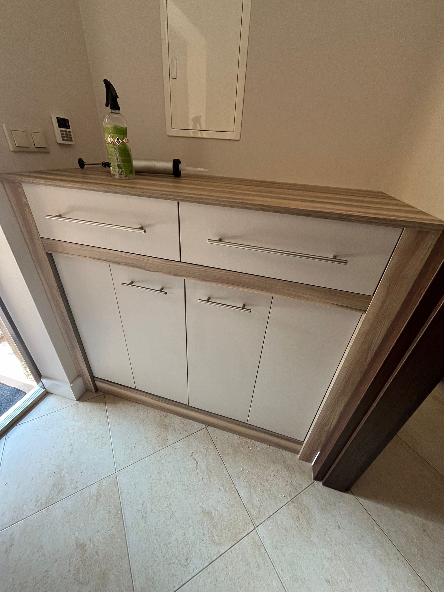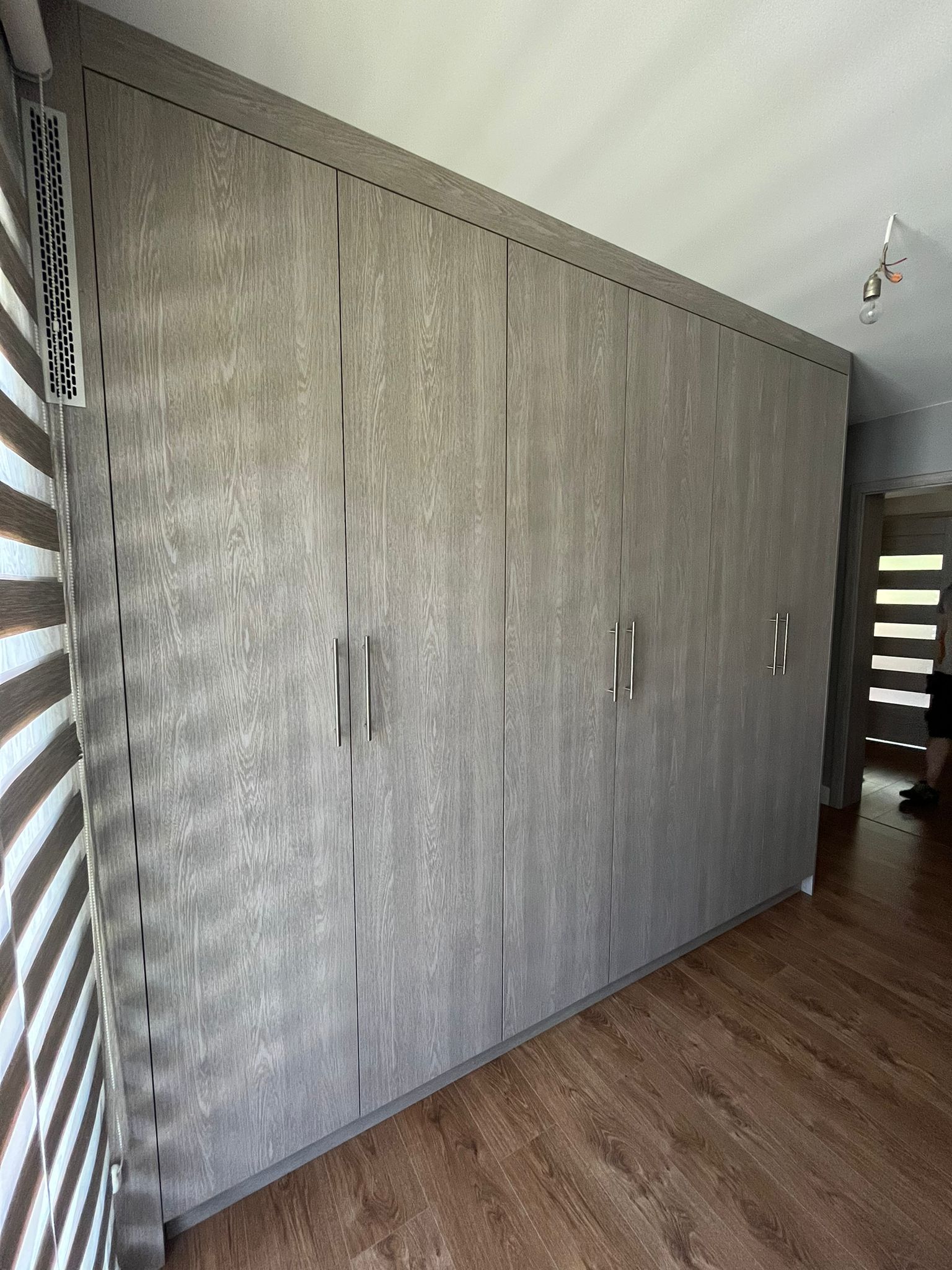 Wszystkie meble zostały wykonane z płyt laminowanych z zachowaniem spójnej stylistyki i funkcjonalności. Komodę do przedpokoju wykonaliśmy z ciemnej płyty Jesion Ładoga R34015, z dwoma praktycznymi szufladami i zamykaną częścią dolną na obuwie. Szafa w sypialni powstała w dekorze Wenge Srebrne R50083, co nadało wnętrzu bardziej klasyczny, elegancki charakter.