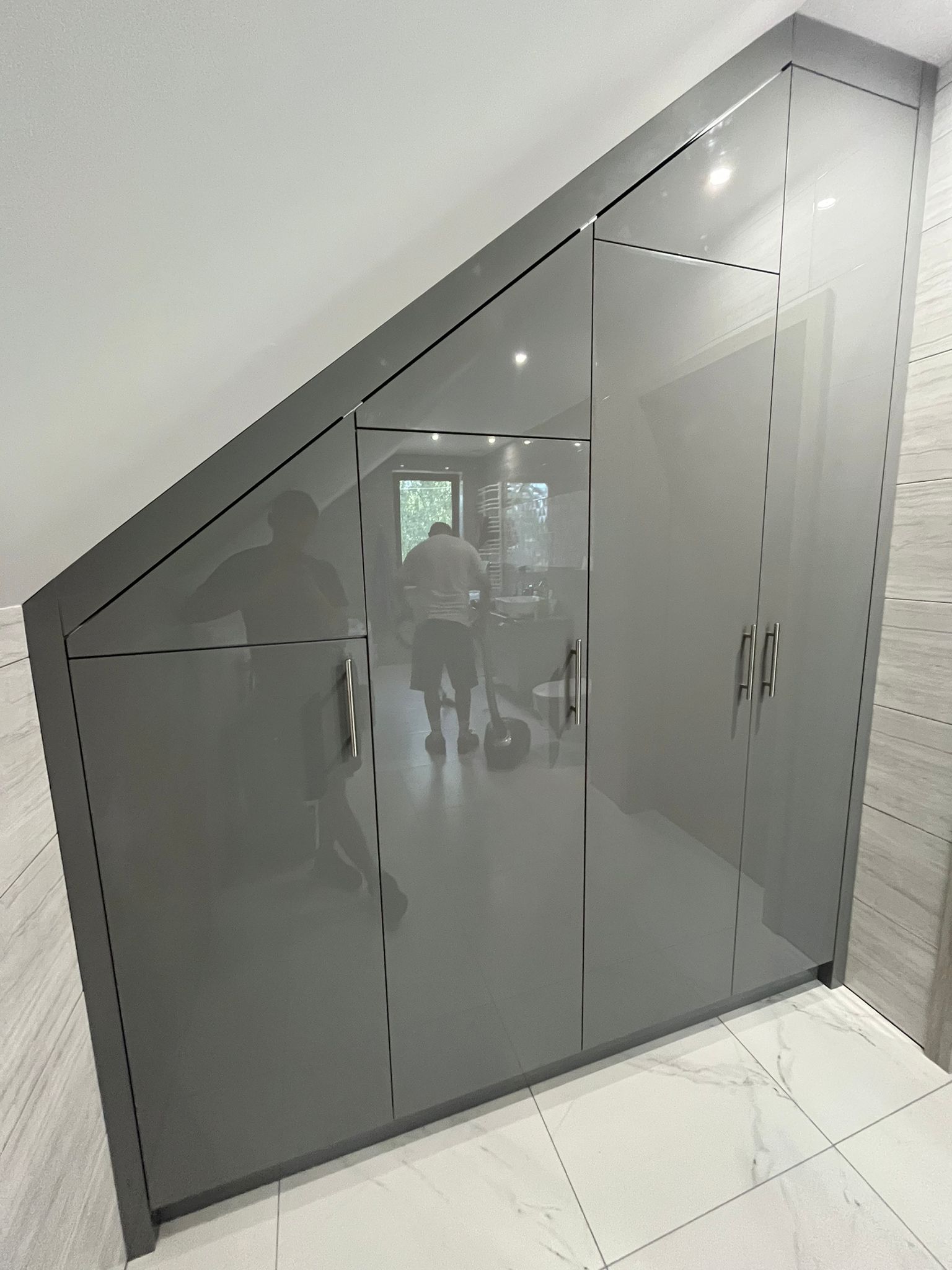 Po pomiarach przystąpiliśmy do przygotowania projektu i produkcji mebli. Cały montaż został przeprowadzony w ciągu 4 dni roboczych. Przebiegł sprawnie, mimo trudniejszych warunków technicznych w łazience. Kluczowe było precyzyjne spasowanie elementów zabudowy pod skosem – nie tylko ze względu na kąt nachylenia, ale również dużą głębokość i konieczność odpowiedniego rozplanowania wnętrza mebla. Każdy centymetr przestrzeni został dokładnie wykorzystany, co przełożyło się na satysfakcjonującą funkcjonalność. Ze względu na niewielką skalę realizacji i dobre przygotowanie przestrzeni przez klienta, wszystkie elementy zostały zamontowane zgodnie z planem i bez konieczności poprawek.