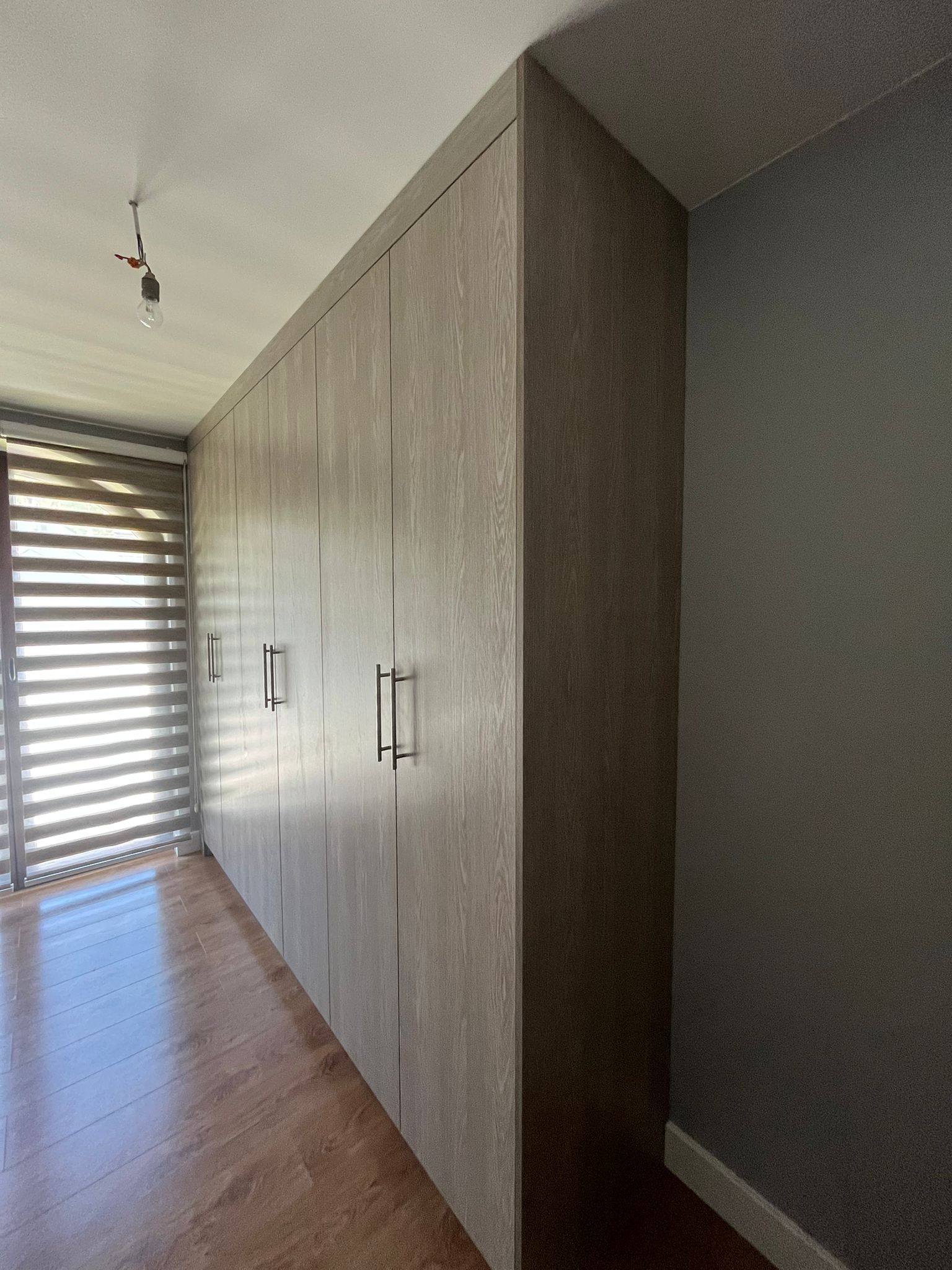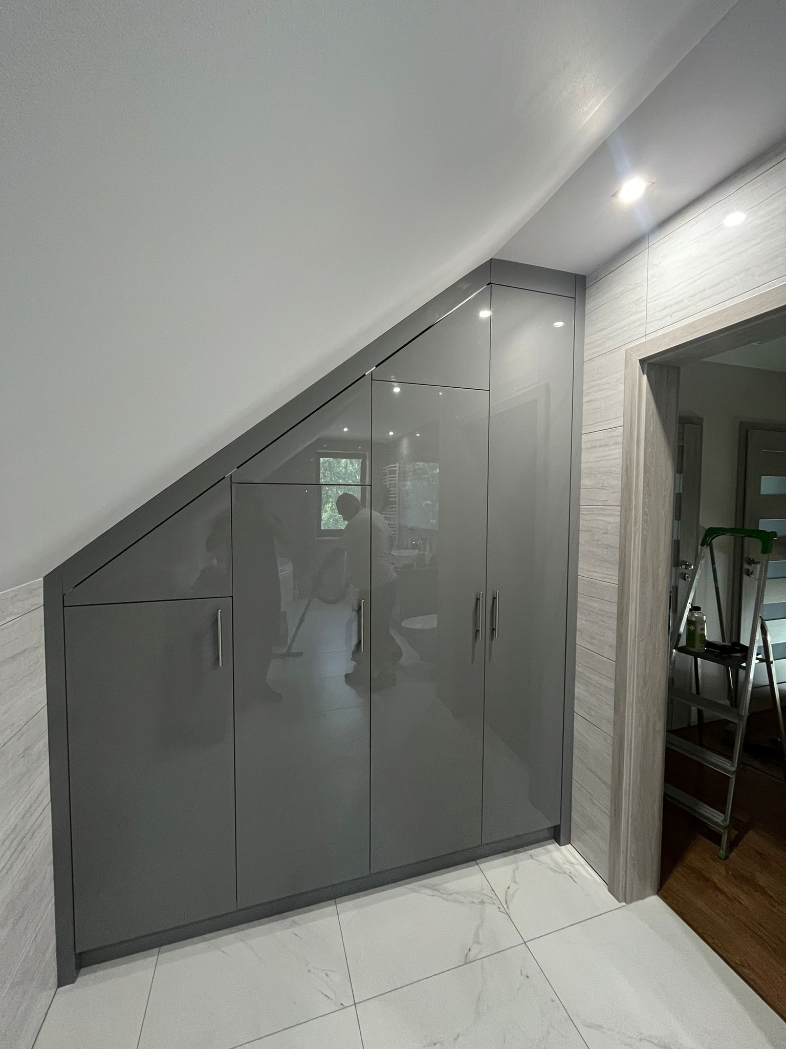 Ta realizacja to dobry przykład tego, jak nawet trzy stosunkowo niewielkie zabudowy mogą znacząco poprawić organizację i estetykę całego mieszkania. W ramach projektu wykonaliśmy pojemną szafę do sypialni, kompaktową komodę do przechowywania butów w przedpokoju oraz wymagającą zabudowę pod skosem w łazience. Kluczowym elementem było indywidualne dopasowanie mebli do trudno ustawnych przestrzeni i wykorzystanie głębokich wnęk w maksymalnie funkcjonalny sposób.