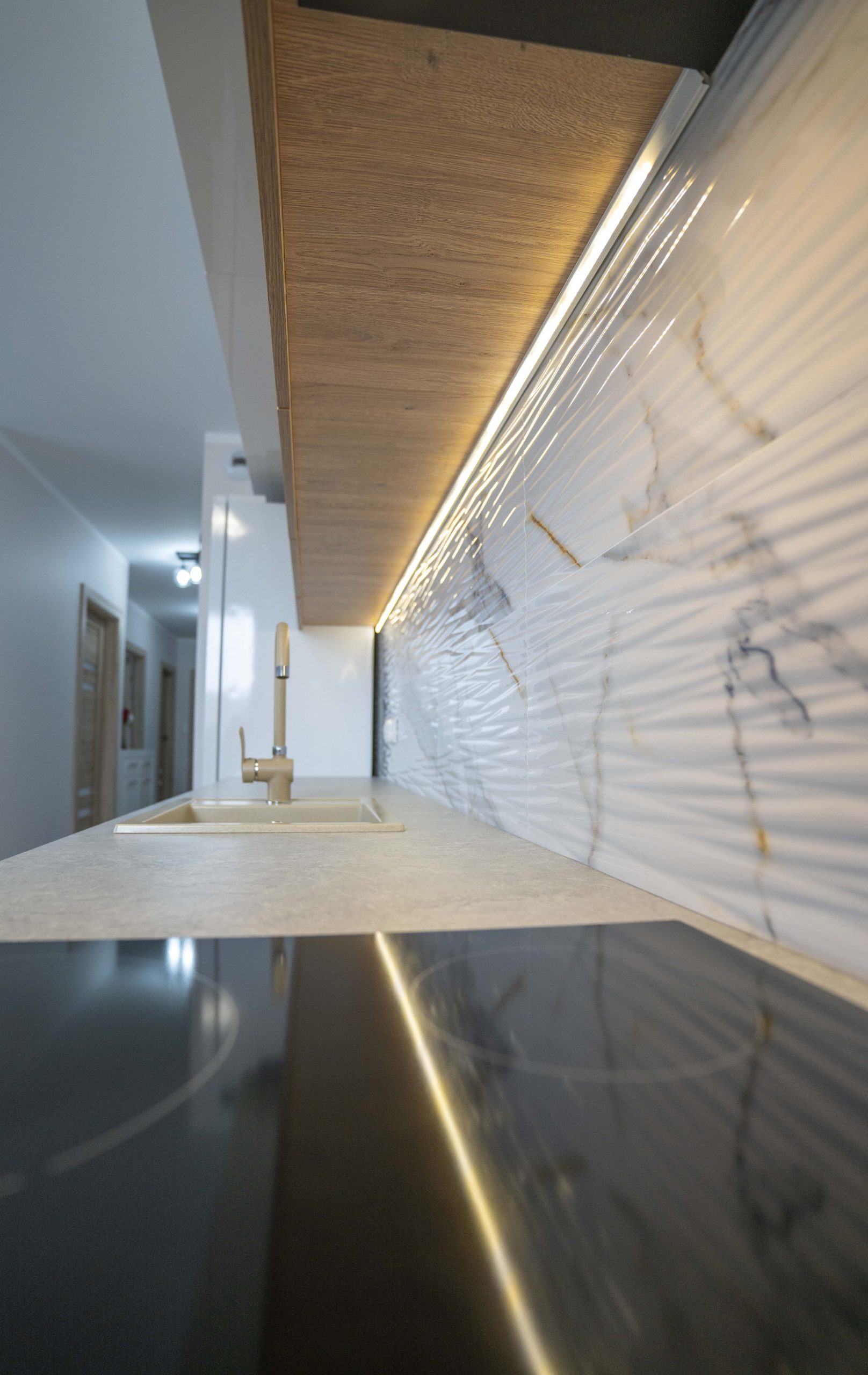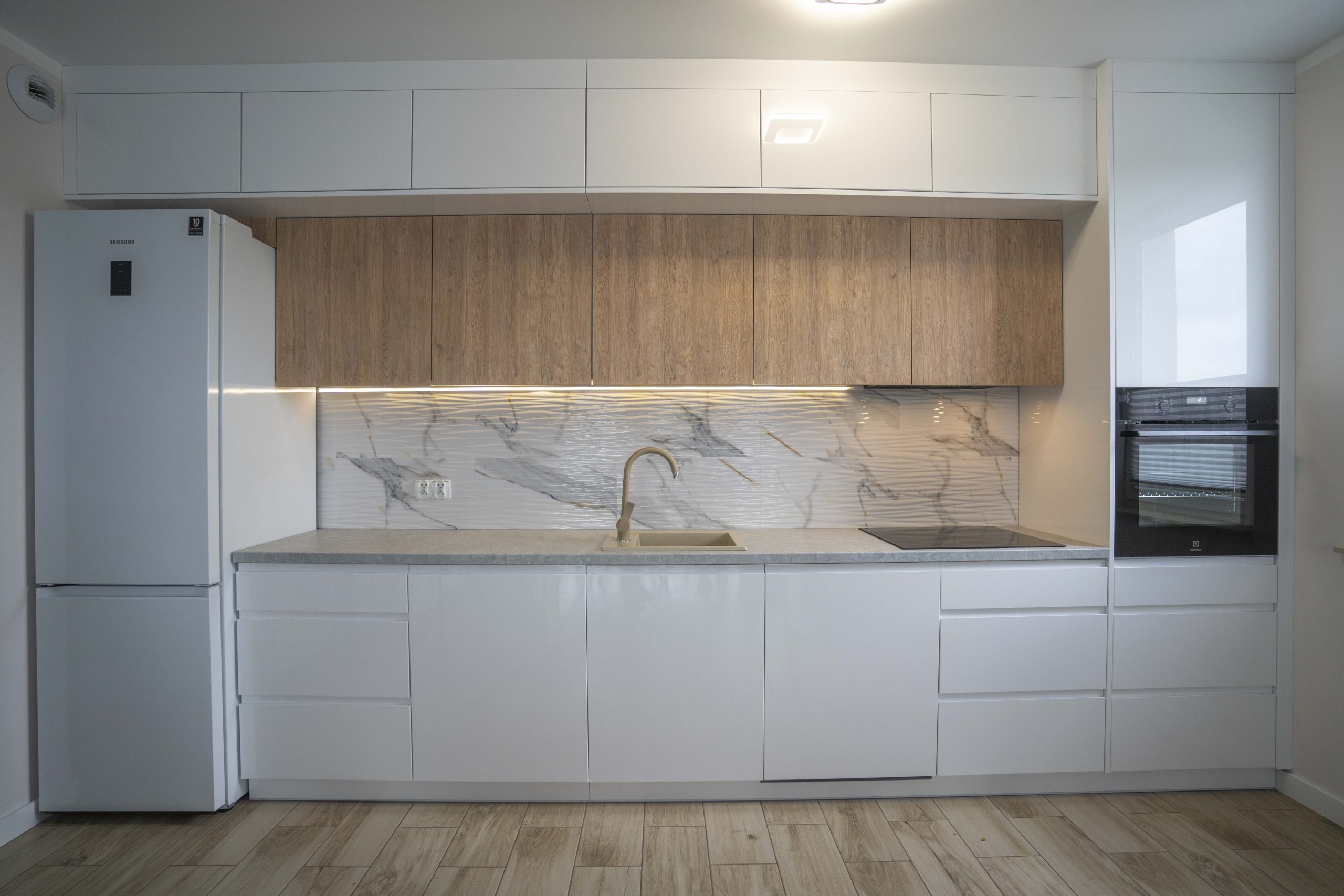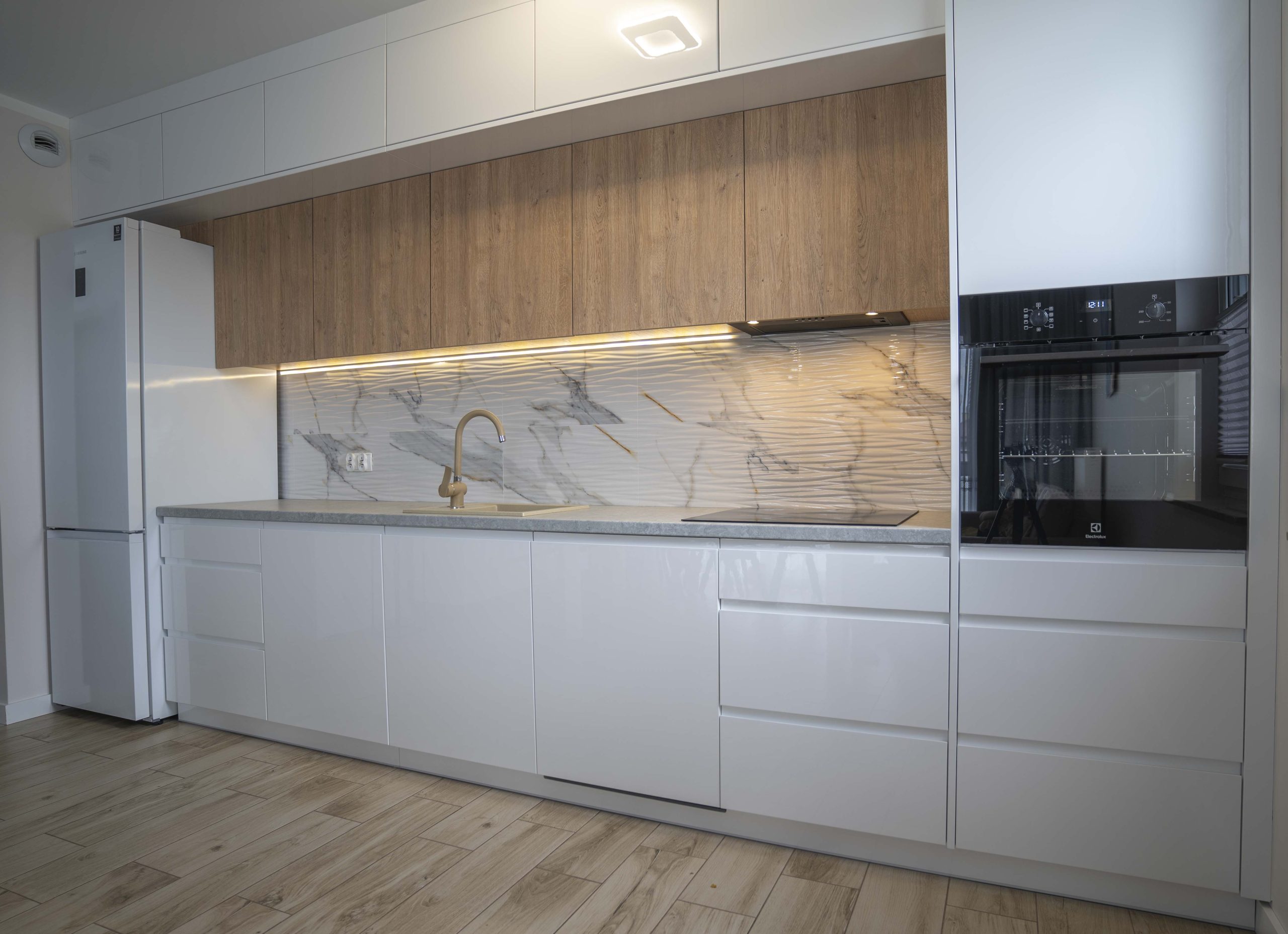 Efekt to kuchnia z dwupoziomową zabudową górną, wykończona w nowoczesnym stylu z subtelnym przełamaniem – dzięki połączeniu połyskującej bieli z ciepłym drewnem. Szafy z Lacobelem i lustrem podkreślają elegancję strefy wejściowej, a meble łazienkowe stanowią spójną kontynuację stylu. Całość przemyślana, dopracowana i – co najważniejsze – doceniona przez klientkę, która po czasie zdecydowała się na aktualizację wybranych elementów. To dla nas zawsze najlepszy znak, że projekt żyje i działa.