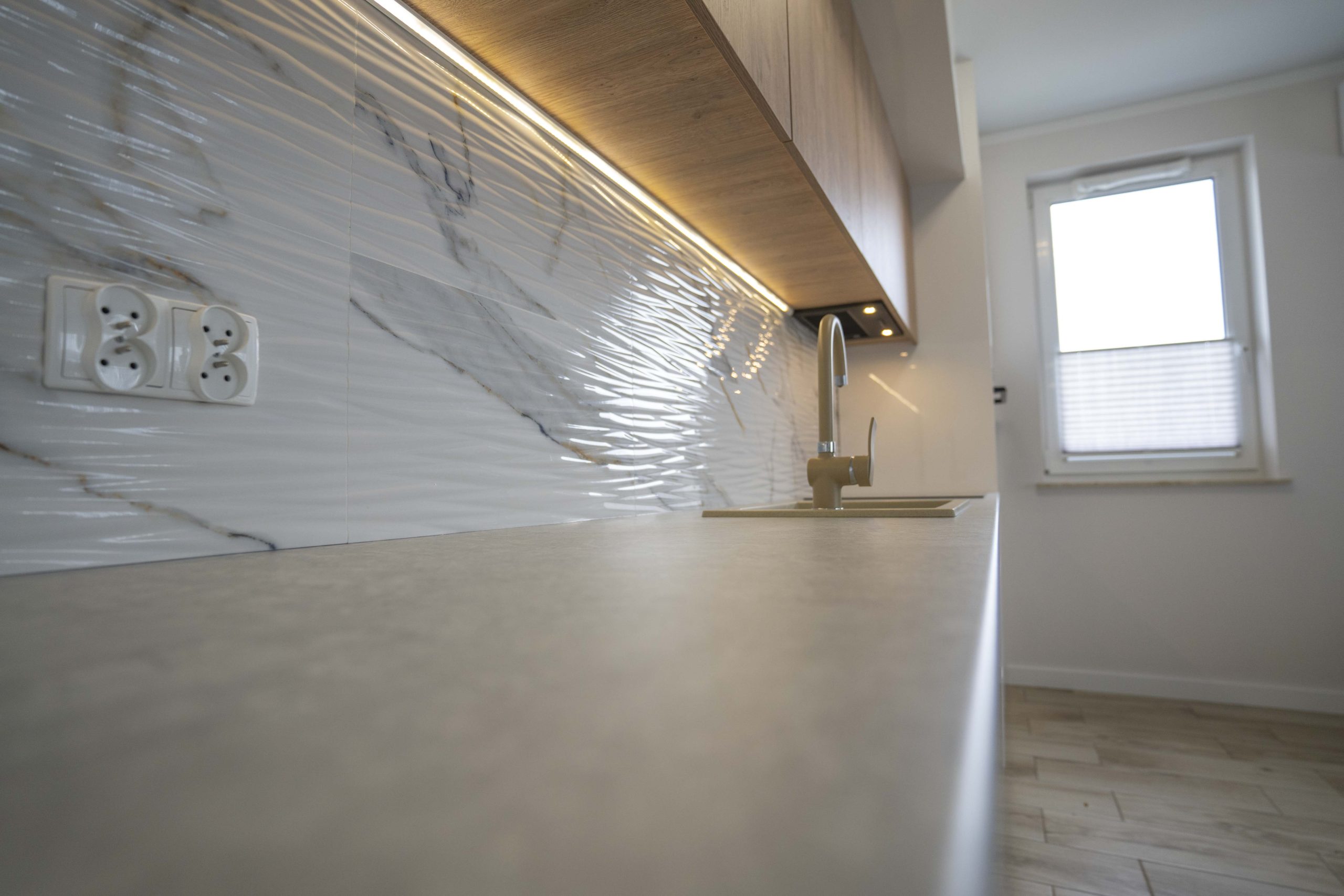 Dodatkowo, kuchnia miała dwie różne głębokości szafek wiszących, co wymagało bardzo precyzyjnych pomiarów i zaplanowania układu linii dolnej.