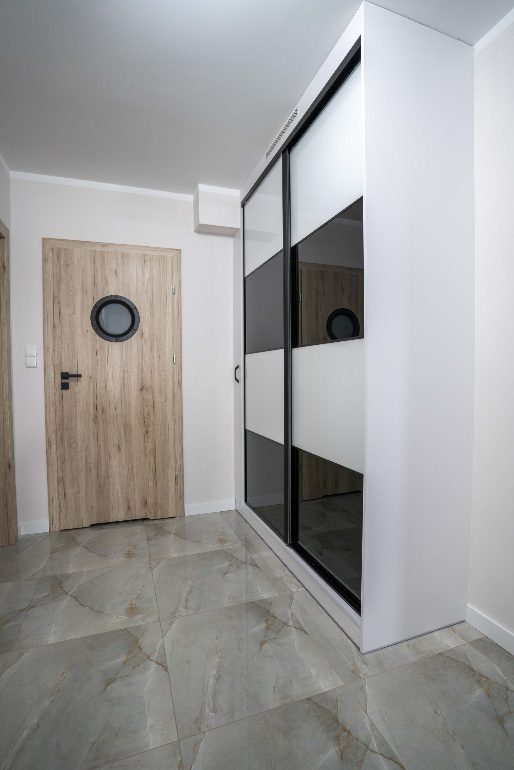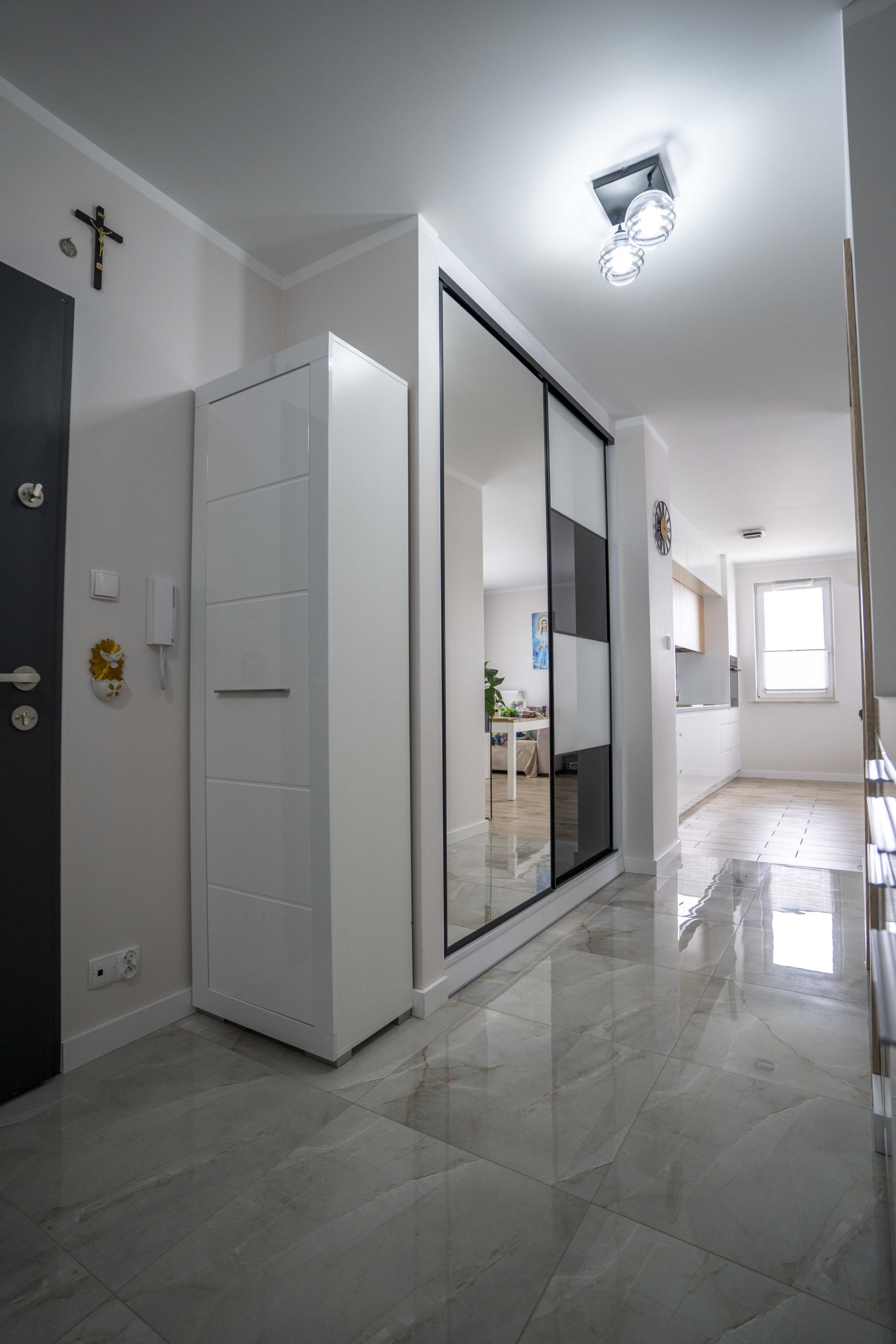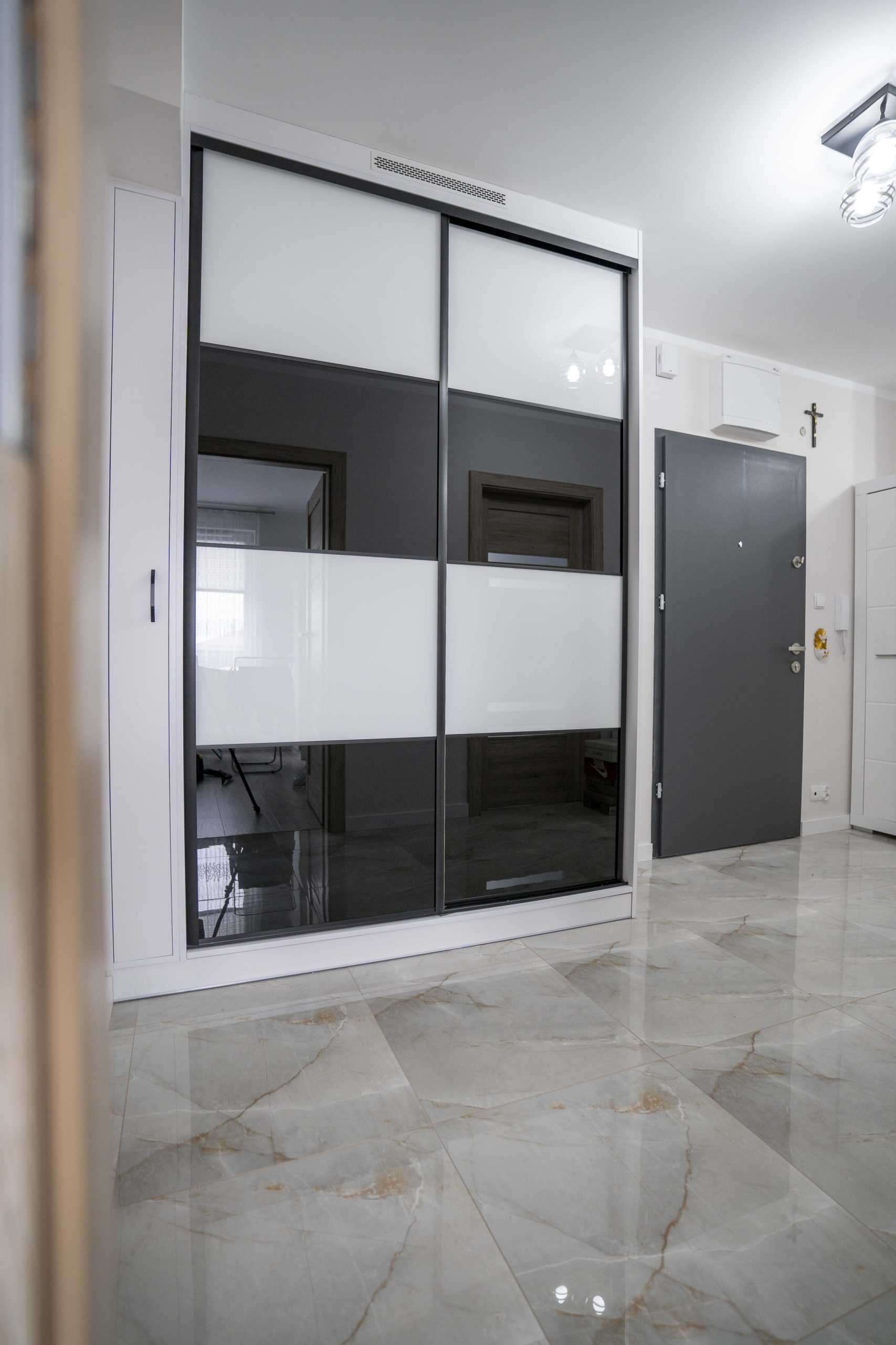 Klientka bardzo jasno określiła swoją wizję – czarno-biała szafa w połysku z wykorzystaniem Lacobelu oraz funkcjonalna, spokojna kuchnia z potencjałem do modyfikacji w przyszłości. Zabudowy miały być dopasowane do mało ustawnych wnętrz, a meble – trwałe, estetyczne i łatwe w utrzymaniu. Dodatkowo zależało jej na zintegrowanej szafce łazienkowej oraz półce nad pralką, które miały zachować spójność z resztą mieszkania.