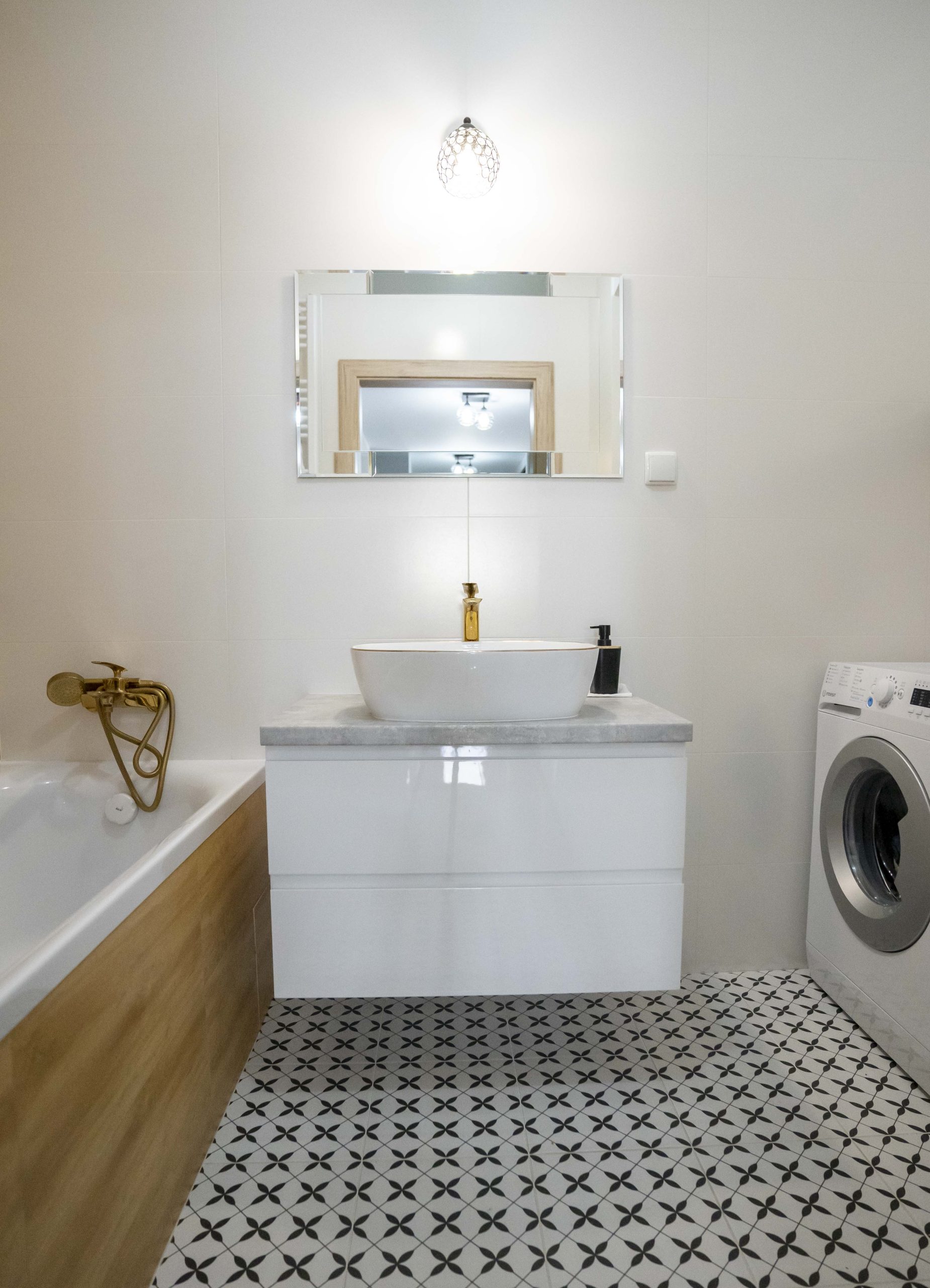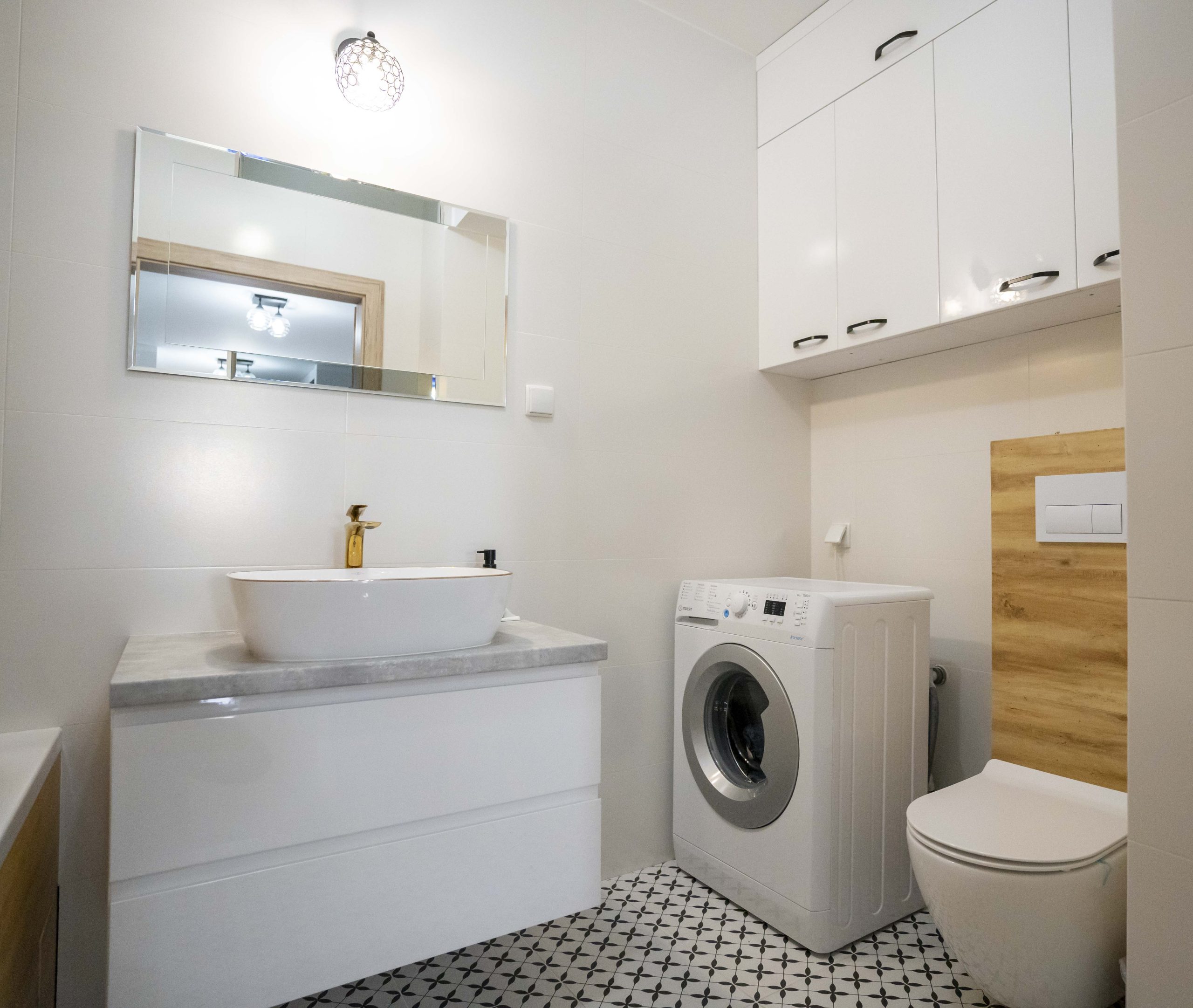 W łazience znalazła się prosta szafka pod umywalkę oraz wisząca szafka nad pralką – obie w estetyce spójnej z kuchnią.
