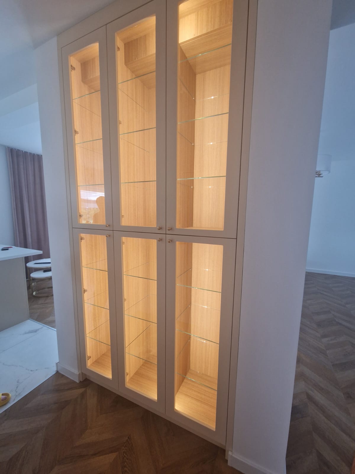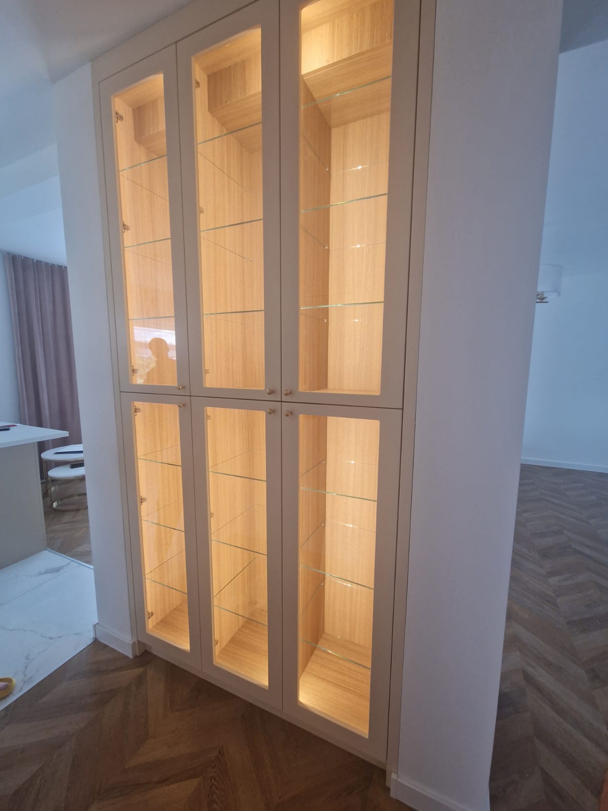 Klient miał bardzo konkretne oczekiwania estetyczne – marzył o witrynie z niesymetrycznymi frontami, wykonanymi w technice frezowanej ramki pod kątem 45 stopni, z wewnętrznym podświetleniem LED i półkami ze szkła opti white. Drugim elementem była szafa w przedpokoju – funkcjonalna i pojemna, ale jednocześnie wpisana w styl całego wnętrza. Oba meble miały zachować delikatność, elegancję i efekt lekkości, mimo swoich wymiarów i funkcji.