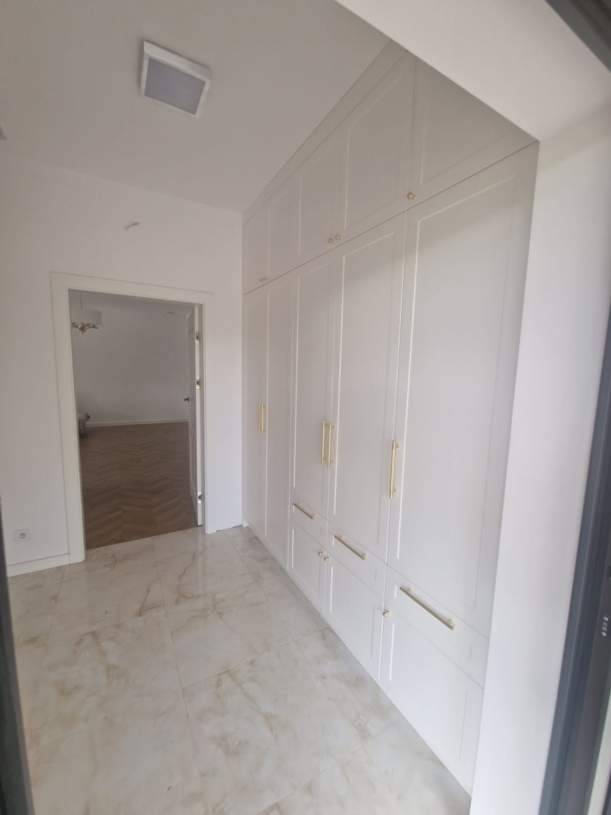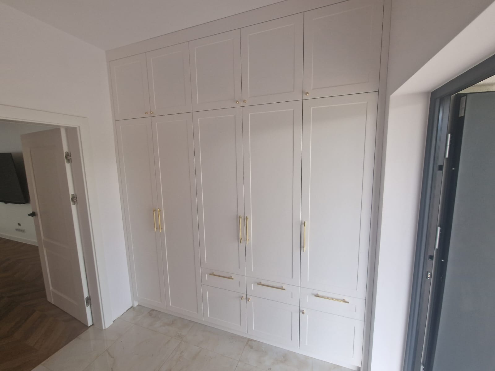 Szafa w wiatrołapie została wykonana z płyty lakierowanej w kolorze NCS S 0300-N, z korpusami z płyty biel arktyczna. Zastosowaliśmy uchwyty relingowe w złotym macie, które dodają nowoczesnego charakteru, jednocześnie pasując do stonowanej elegancji wnętrza.