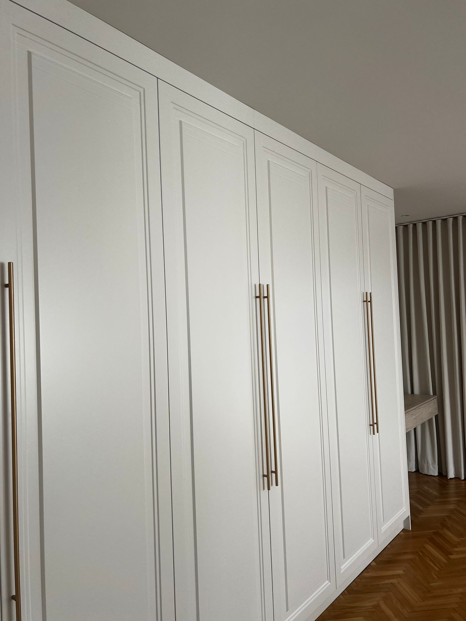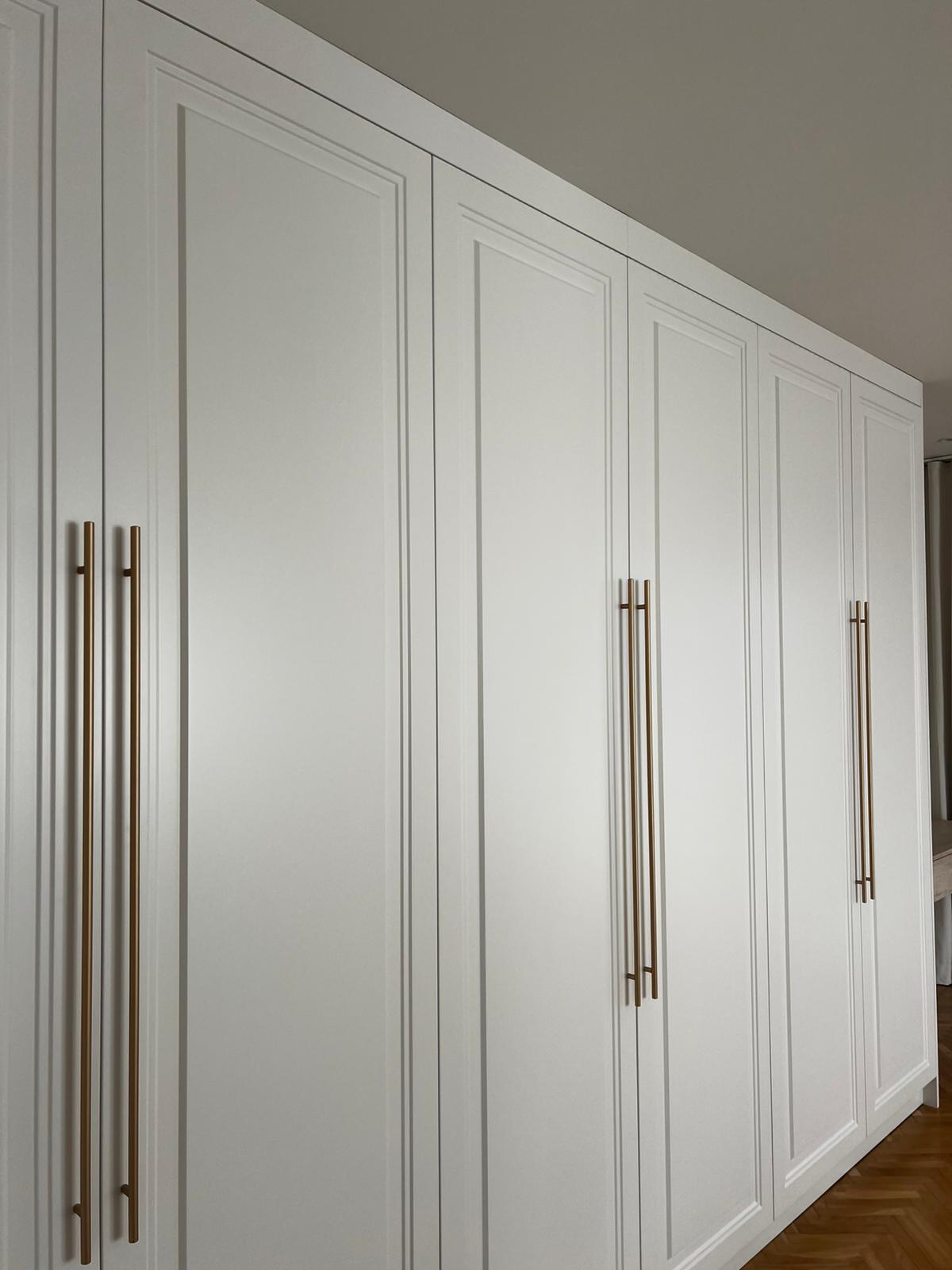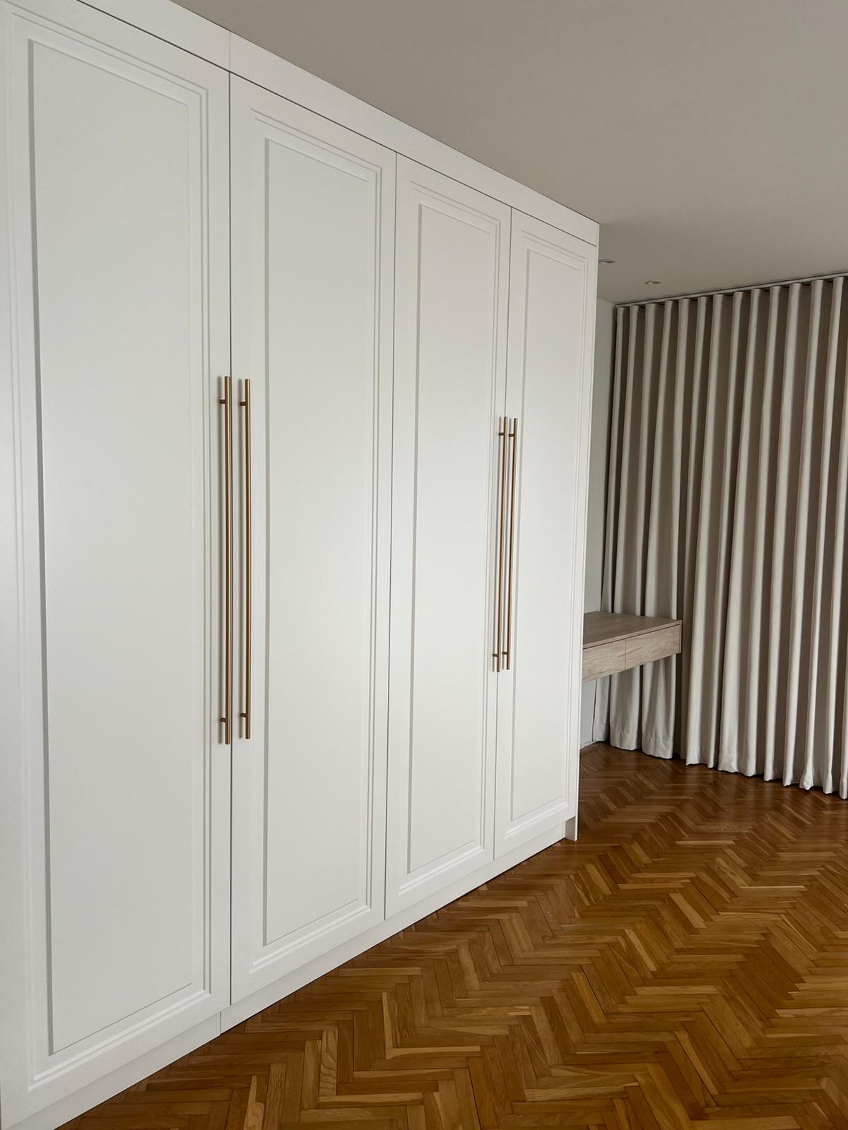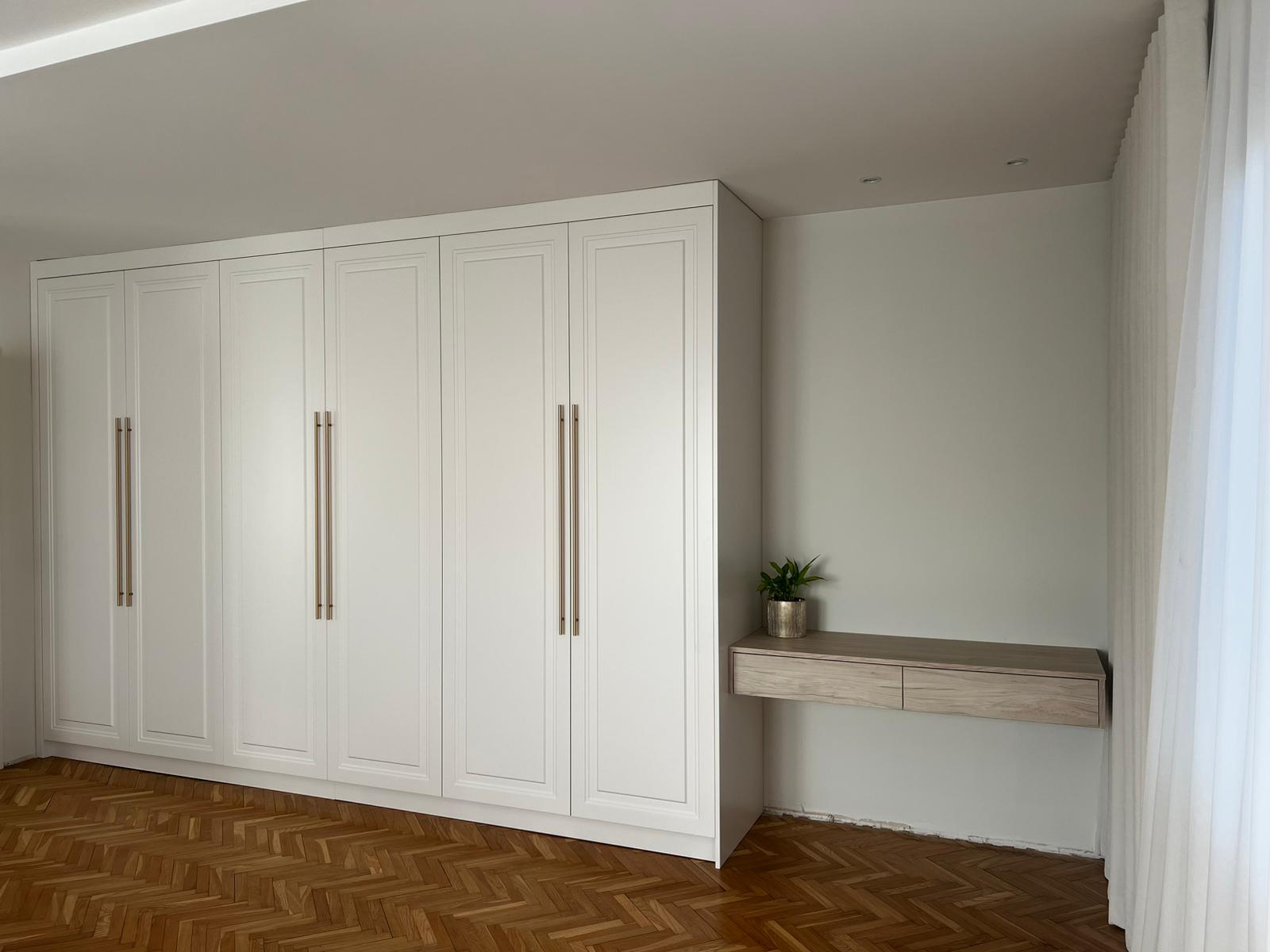 Klient oczekiwał maksymalnej funkcjonalności w dwóch przestrzeniach – sypialni oraz pokoju dziecka. W sypialni kluczowa była estetyka: głęboko frezowane, lakierowane fronty w bieli matowej miały nadać wnętrzu lekkości i elegancji. Toaletka miała być praktycznym uzupełnieniem szafy, dopasowanym zarówno wizualnie, jak i funkcjonalnie. W pokoju dziecka klientowi zależało na kompleksowej zabudowie – zintegrowanej z biurkiem oraz miejscem do przechowywania. Projekt musiał spełniać wymogi codziennego użytkowania, być odporny na uszkodzenia i łatwy do utrzymania w czystości. Jednocześnie klient cenił sobie spójność estetyczną i praktyczne podejście do projektowania.