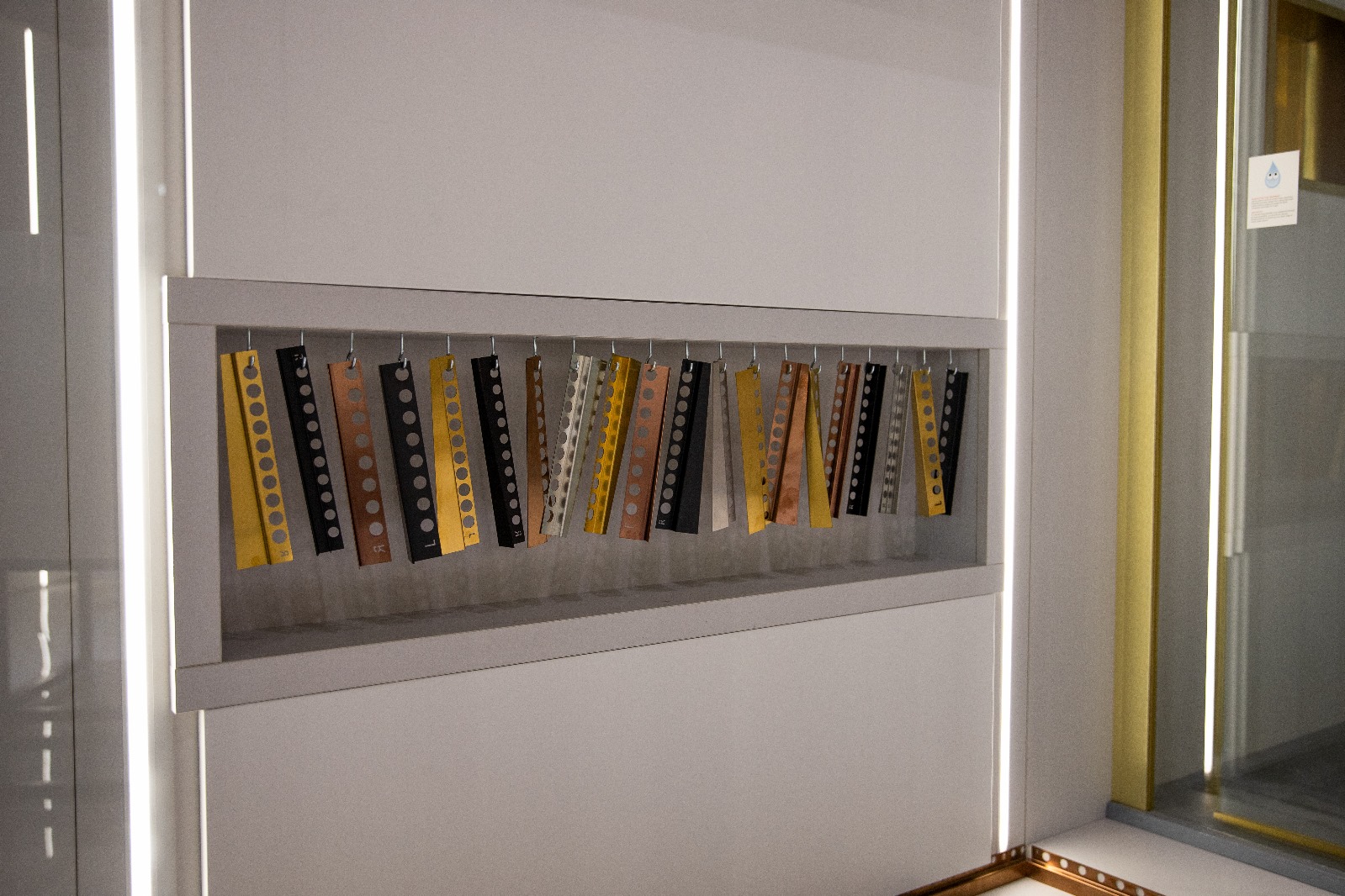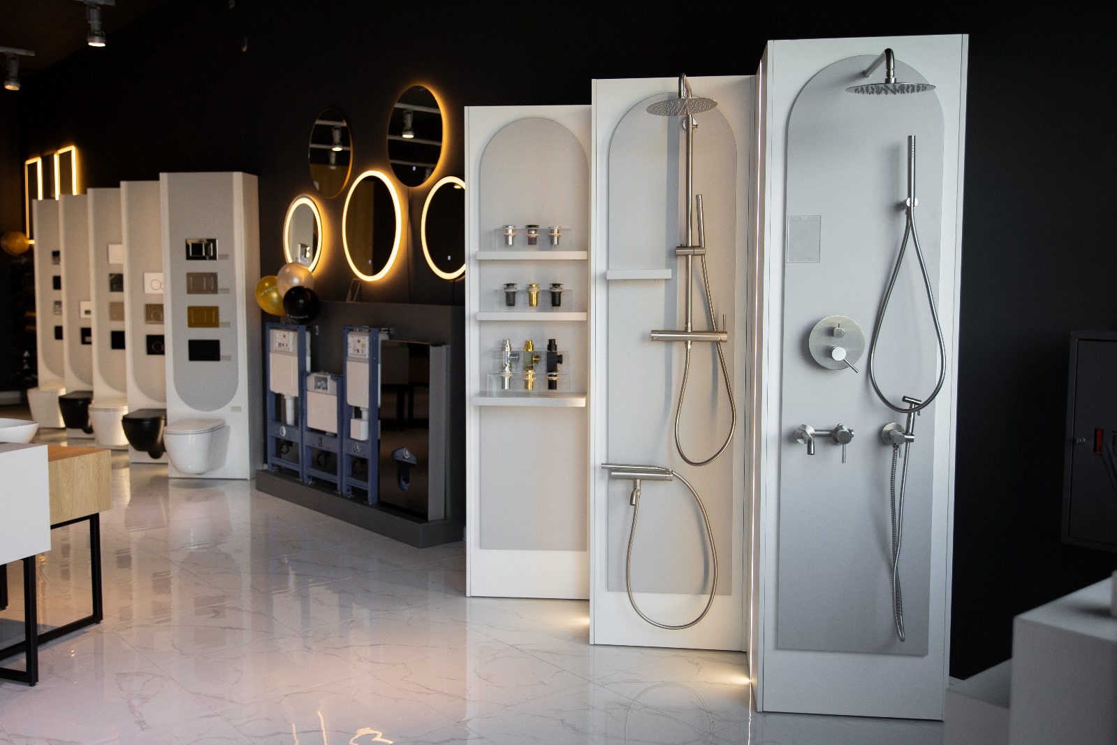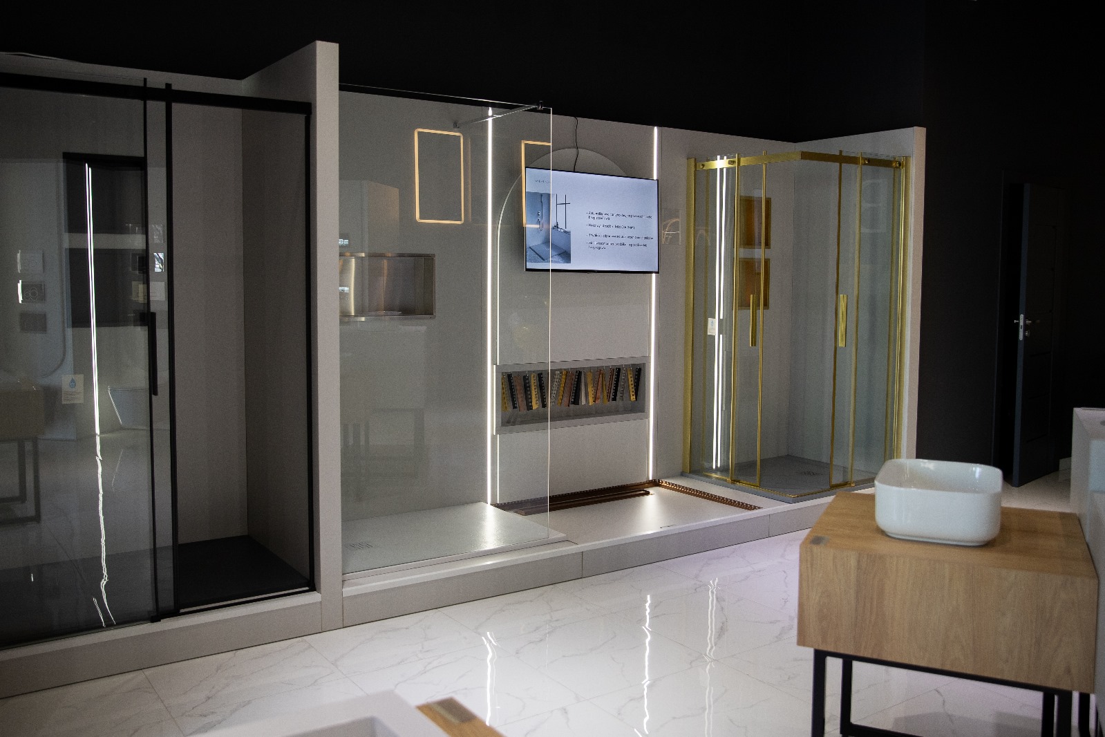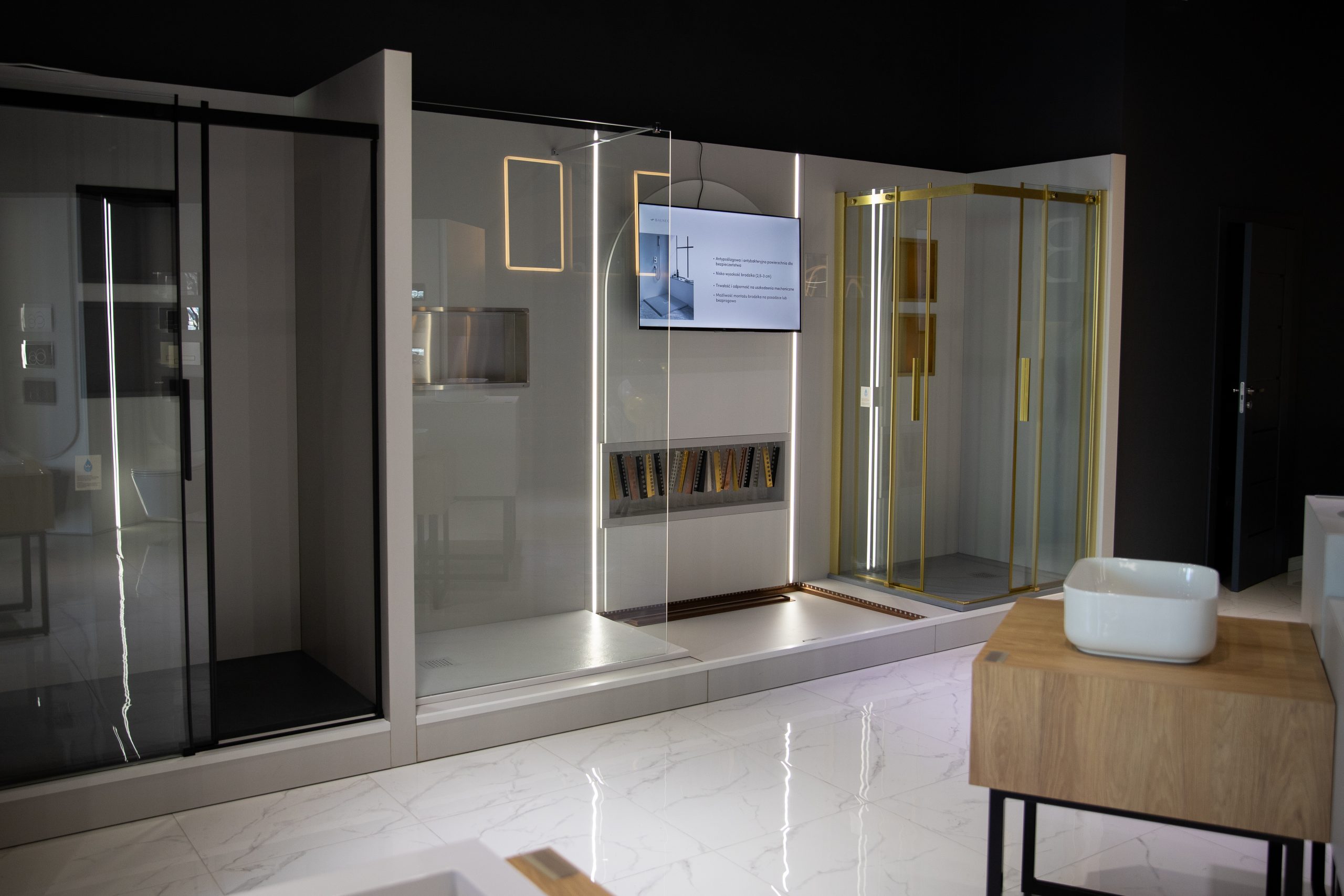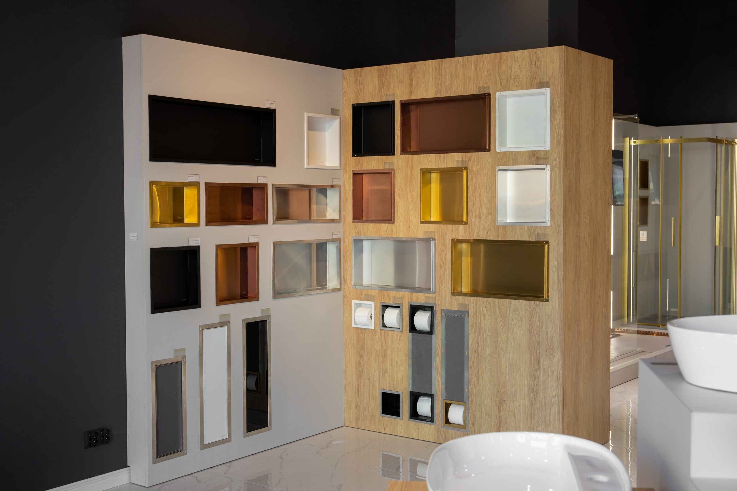 Wszystkie meble zostały wykonane z wysokiej jakości materiałów: płyty Egger w odcieniach jasnej szarości (U708 ST9) oraz drewna (H3730 ST10 – hikora naturalna), a także ciemnego antracytu (U960 ST9 – Onyx szary) w ekspozytorach. Kubiki pod umywalki i baterie zostały osadzone na metalowych, malowanych proszkowo nogach w kolorze czarny mat. Fronty zostały wykonane w różnych kolorach i wykończeniach – miedź, złoto, biały, czarny mat i inox – by podkreślić charakter wystawowych produktów.Zastosowaliśmy także indywidualnie projektowane panele lakierowane na kolor NCS S-2000-N mat (idealnie dobrany do logotypu), a sama ściana z logo została efektownie podświetlona taśmą LED, co stworzyło nowoczesny i profesjonalny efekt.
