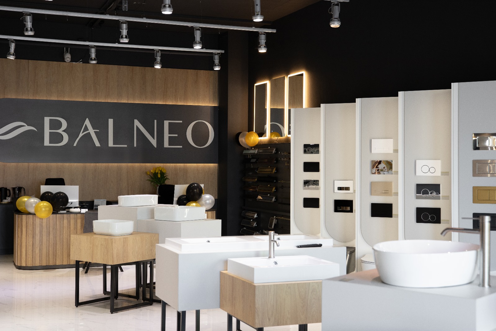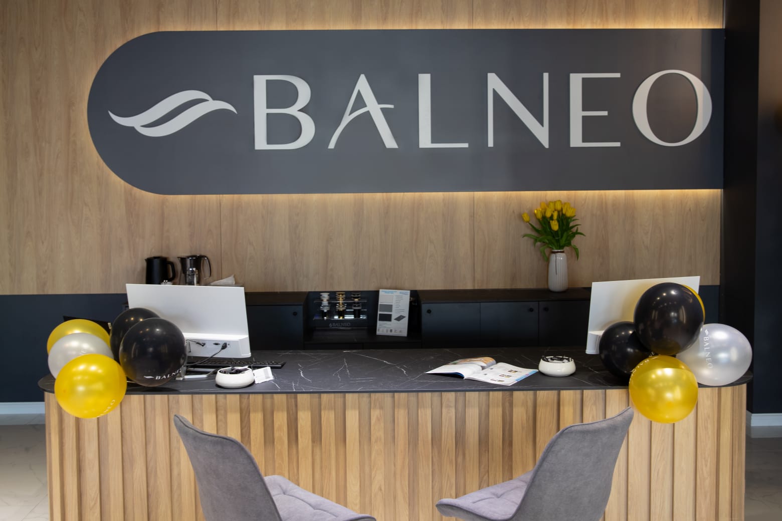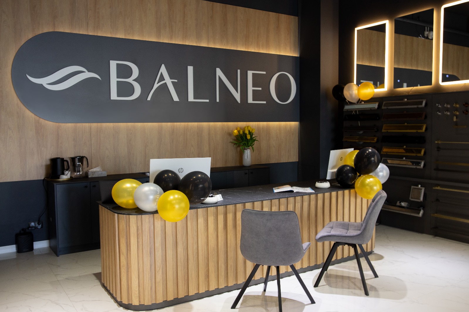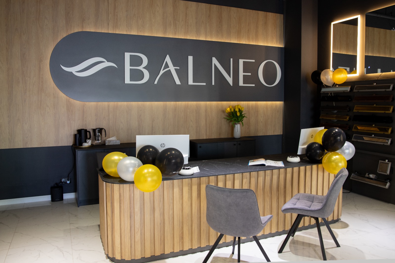 Realizacja showroomu Balneo – ekspozytory, lada recepcyjna i ściana z logo | MiD Business
