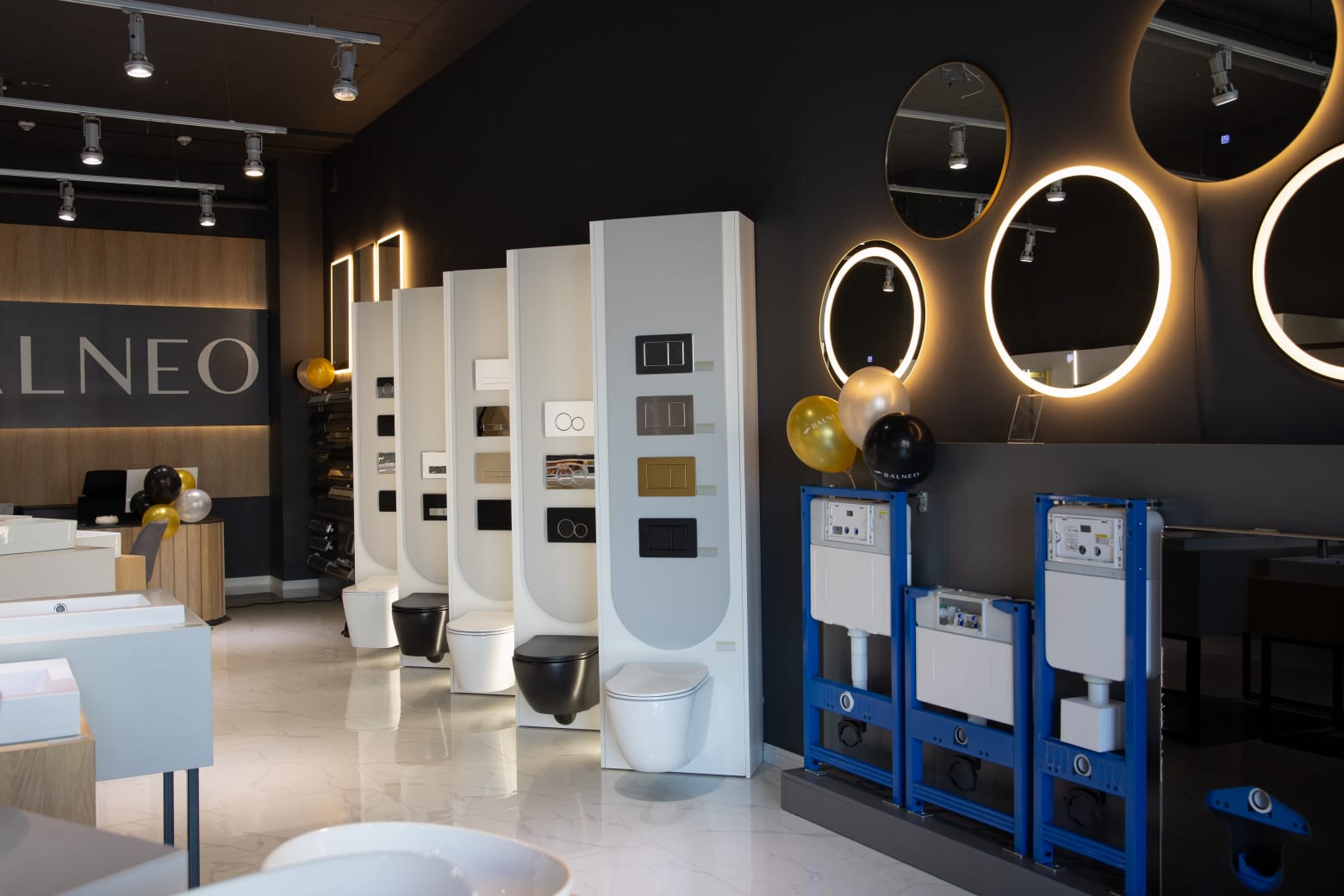 Showroom Balneo to dziś przestrzeń, która wzbudza zachwyt – zarówno pod względem estetycznym, jak i użytkowym. Wnętrze jest dopracowane w każdym calu – od zaokrąglonej lady, przez efektowne ekspozytory i wykończone ściany, po imponującą ścianę z podświetlanym logo. Wszystkie elementy funkcjonują zgodnie z założeniami projektowymi, a dzięki naszej staranności udało się idealnie odwzorować koncepcję przygotowaną przez architektkę. To jedna z tych realizacji, z których jesteśmy szczególnie dumni – nie tylko ze względu na efekt wizualny, ale również ze względu na to, że cały proces przebiegł sprawnie i profesjonalnie, mimo napiętego terminu i wysokich wymagań klienta.