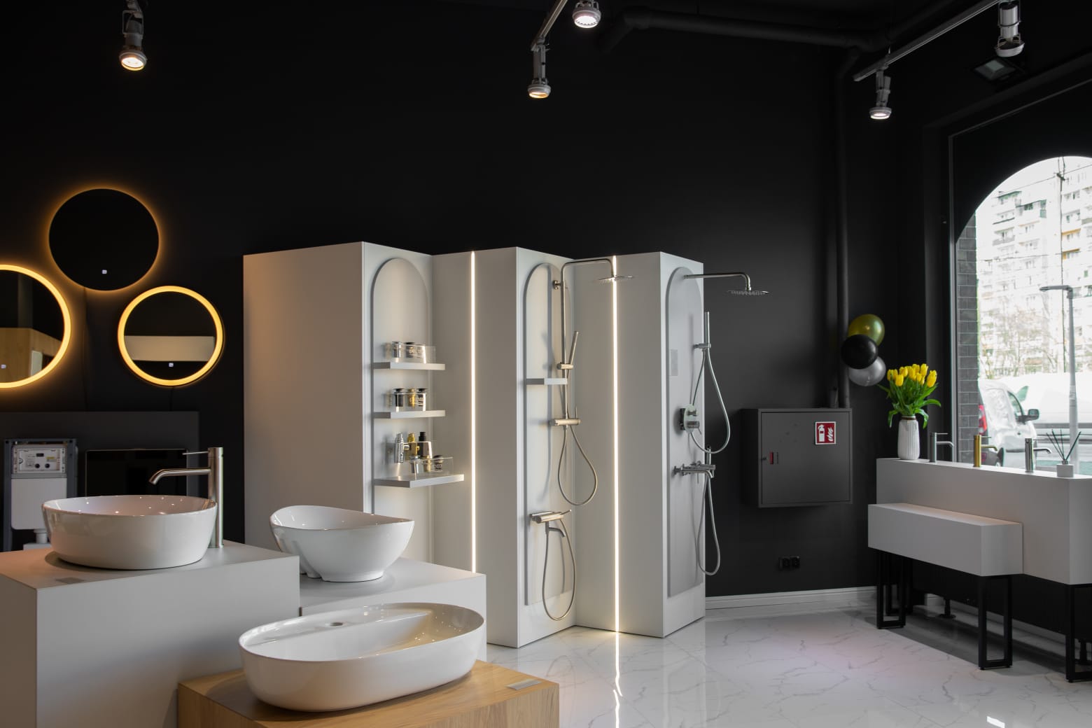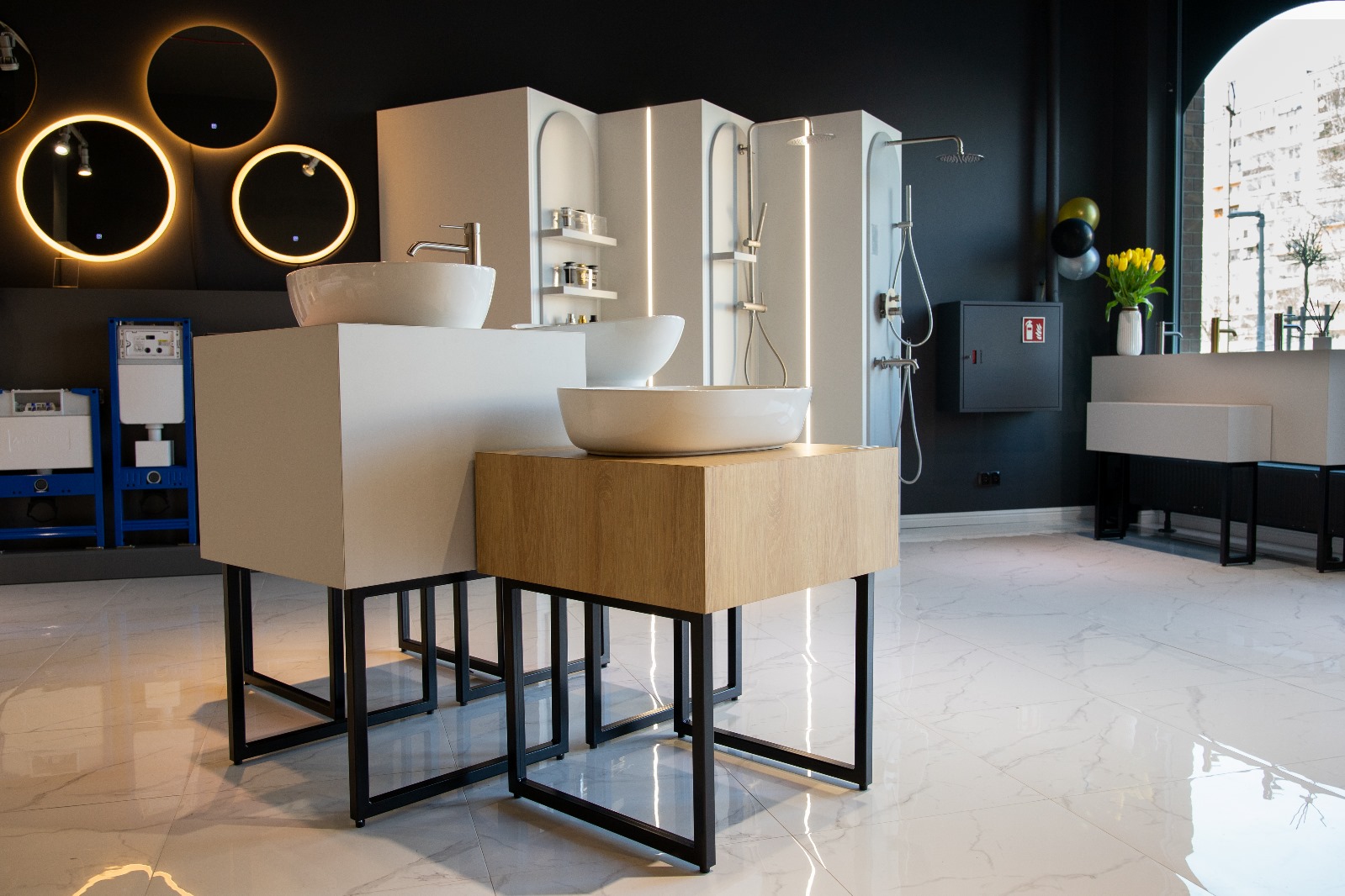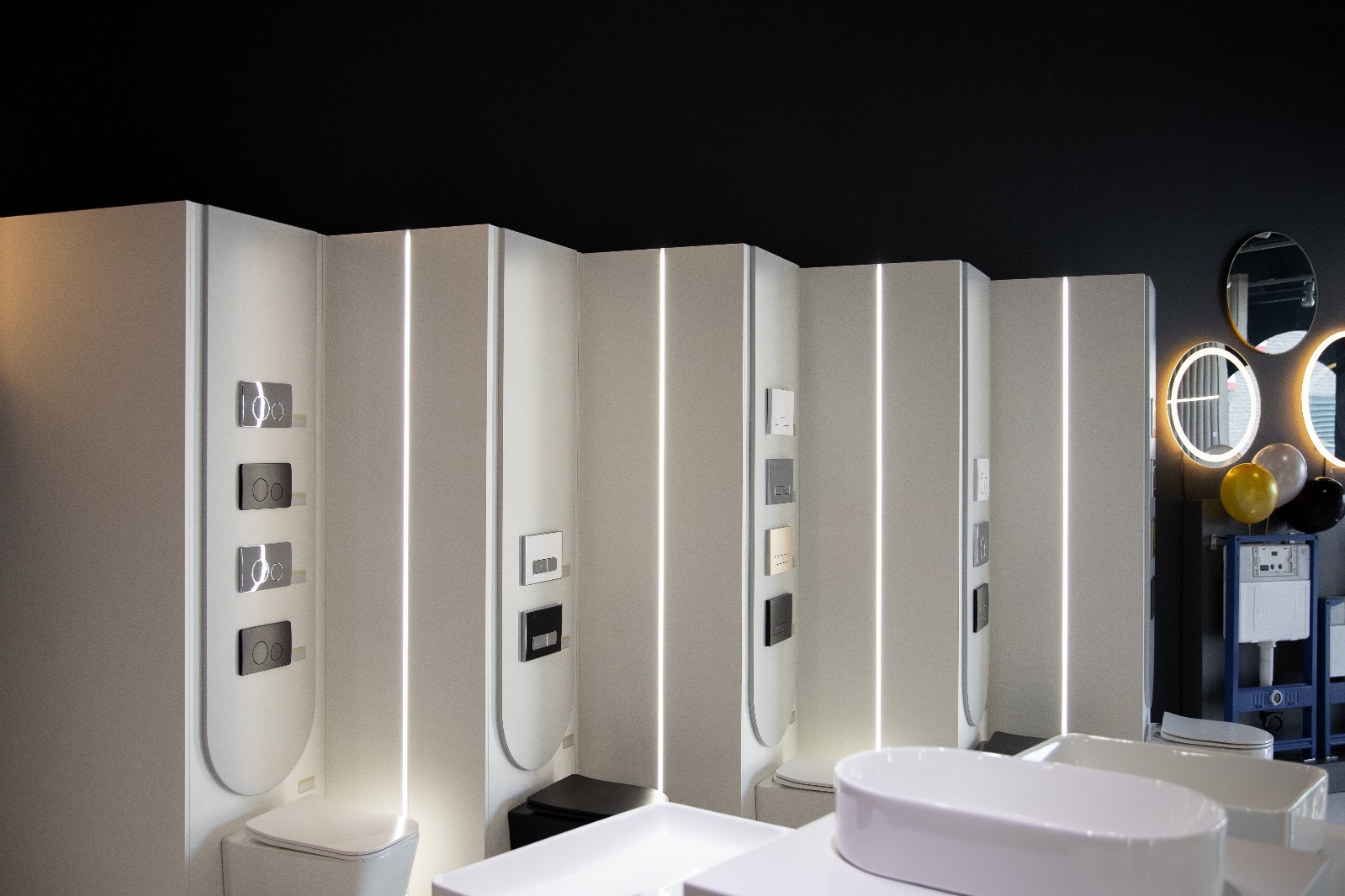 Lady, ekspozytory, podesty, ściany z lamelami, kubiki pod baterie i umywalki, zabudowy, ściana z logo